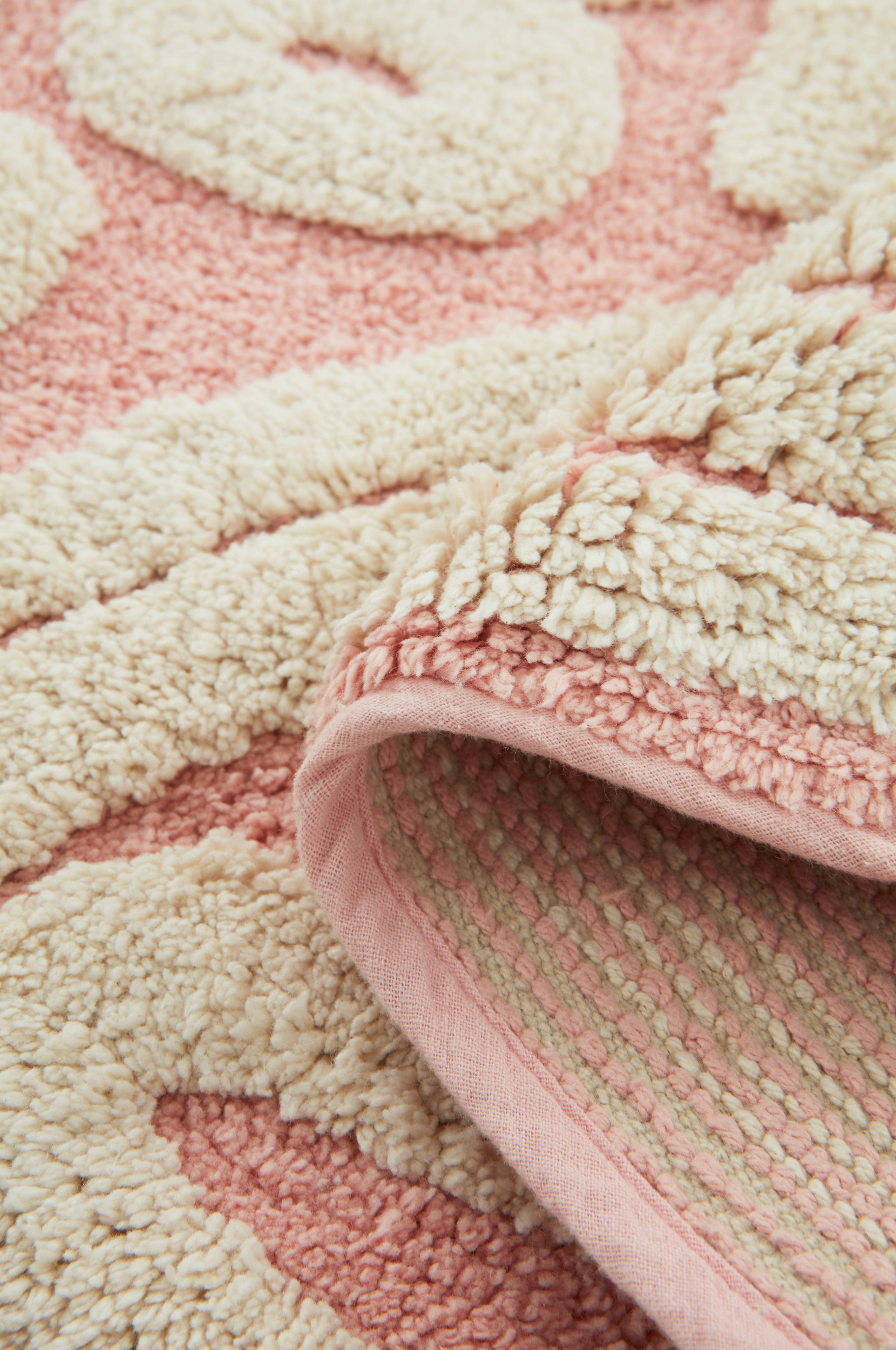 Tuftet bomullsteppe med garnfarget mønster i lekre, lyse former på rosa bunn. Mønsteret forsterkes av varierende lugghøyde. Teppet er mykt og herlig å sitte og leke på. Lugghøyde kort lugg 1-1,1 cm, lang 1,3-1,4 cm. Tykkelse 1,4-1,5 cm. 1900-2000 g/m².
