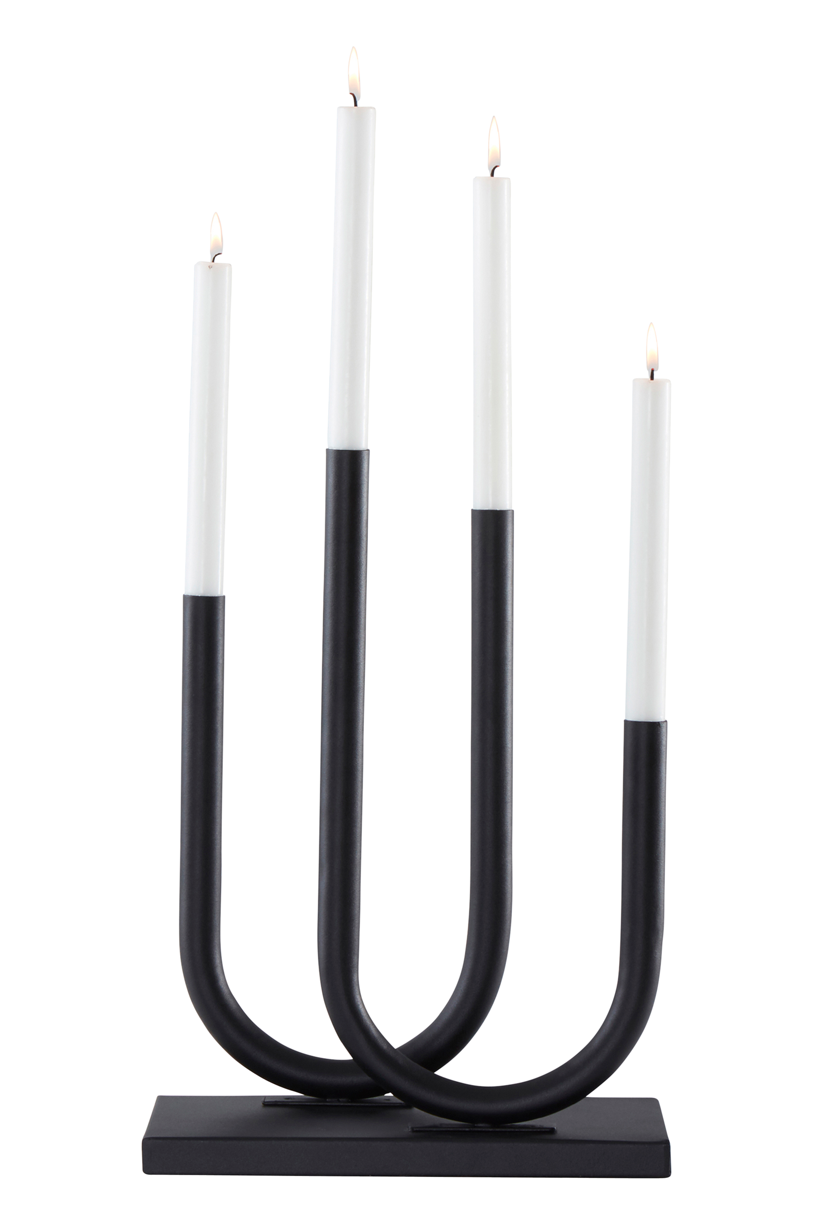 Lysestake av metall med fire lysholdere. Bowie er en praktfull lysestake med rene linjer som smelter inn i mange ulike stiler. Tidløs modell med to u-formede rør med lysholdere i ulike høyde. Foten har tekstilkledd bunn for at den skal stå mykt og stødig.