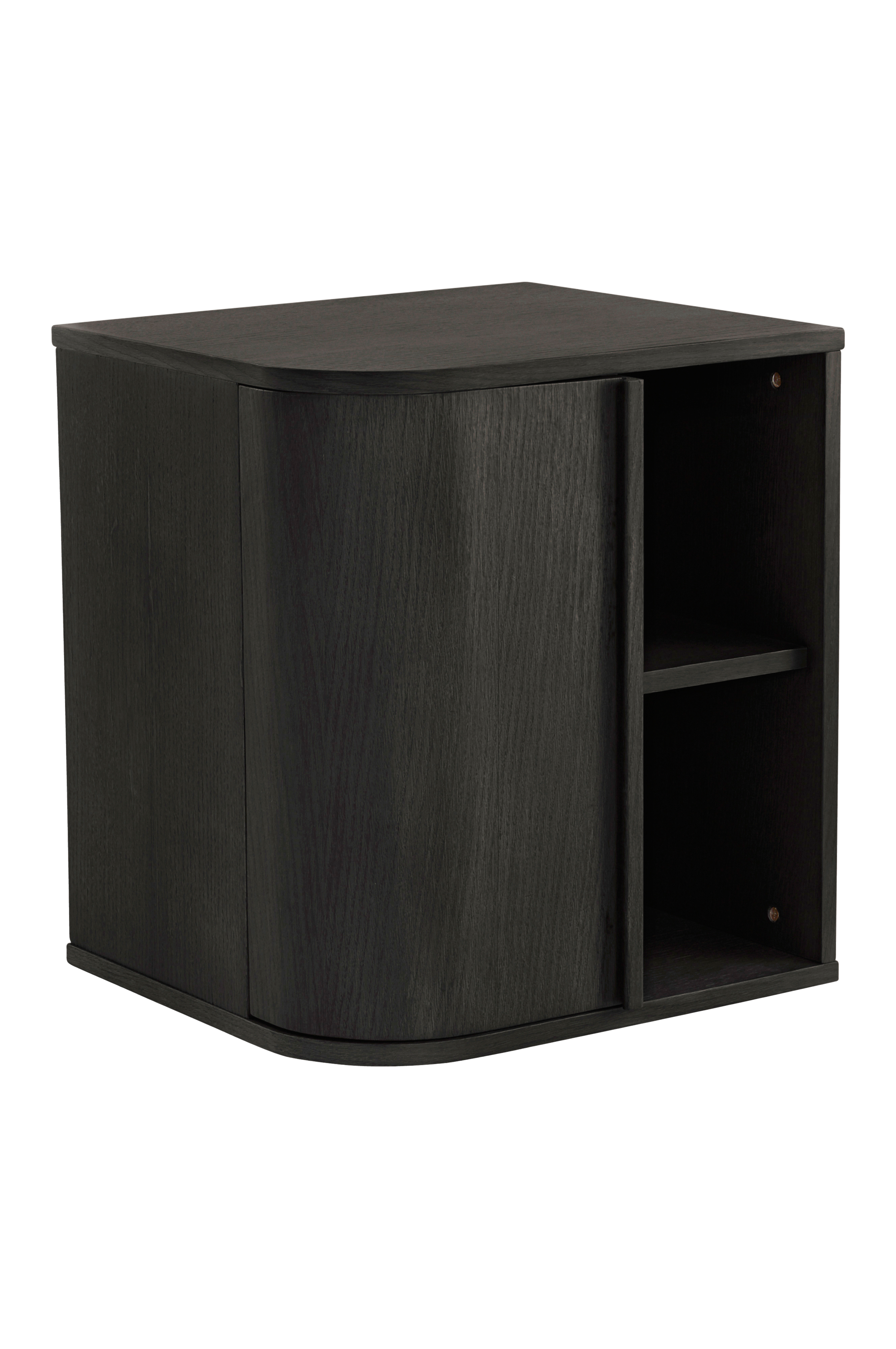 Nattbord av MDF med eikefinér på eksponerte flater. BRAUX er et flott nattbord som oser luksus og stil. Mykt avrundede hjørner i forkant forsterker den elegante følelsen. Nattbordet BRAUX har en dyp, buet dør som gir halve skapet skjult oppbevaring, og kompletteres med to åpne hyller hvor du kan oppbevare det du enkelt vil nå. Delen bak døren har også en fast hylle slik at du totalt har fire rom til praktisk oppbevaring. Nattbordet er behandlet med vannbasert lakk. Noe montering kreves. Monteringsanvisning medfølger.