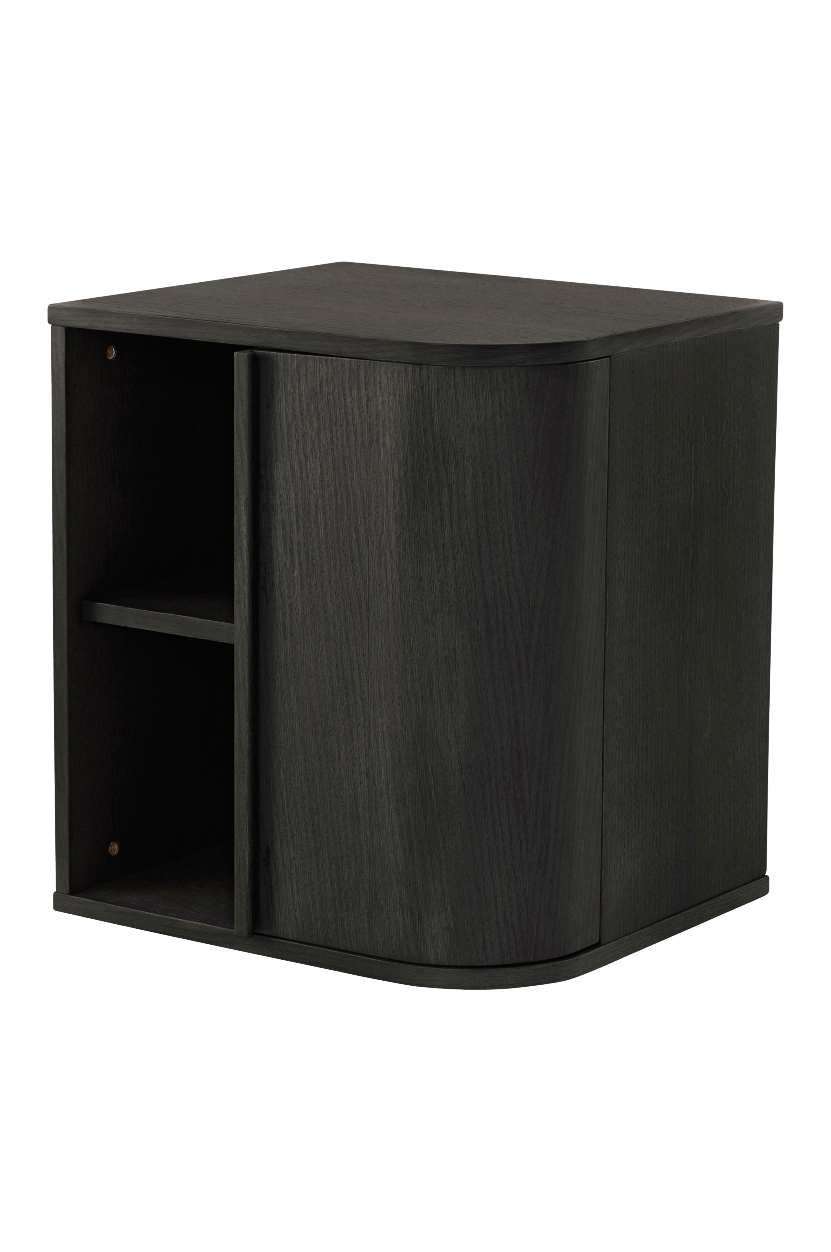 Nattbord av MDF med eikefinér på eksponerte flater. BRAUX er et flott nattbord som oser luksus og stil. Mykt avrundede hjørner i forkant forsterker den elegante følelsen. Nattbordet BRAUX har en dyp, buet dør som gir halve skapet skjult oppbevaring, og kompletteres med to åpne hyller hvor du kan oppbevare det du enkelt vil nå. Delen bak døren har også en fast hylle slik at du totalt har fire rom til praktisk oppbevaring. Nattbordet er behandlet med vannbasert lakk. Noe montering kreves. Monteringsanvisning medfølger.
