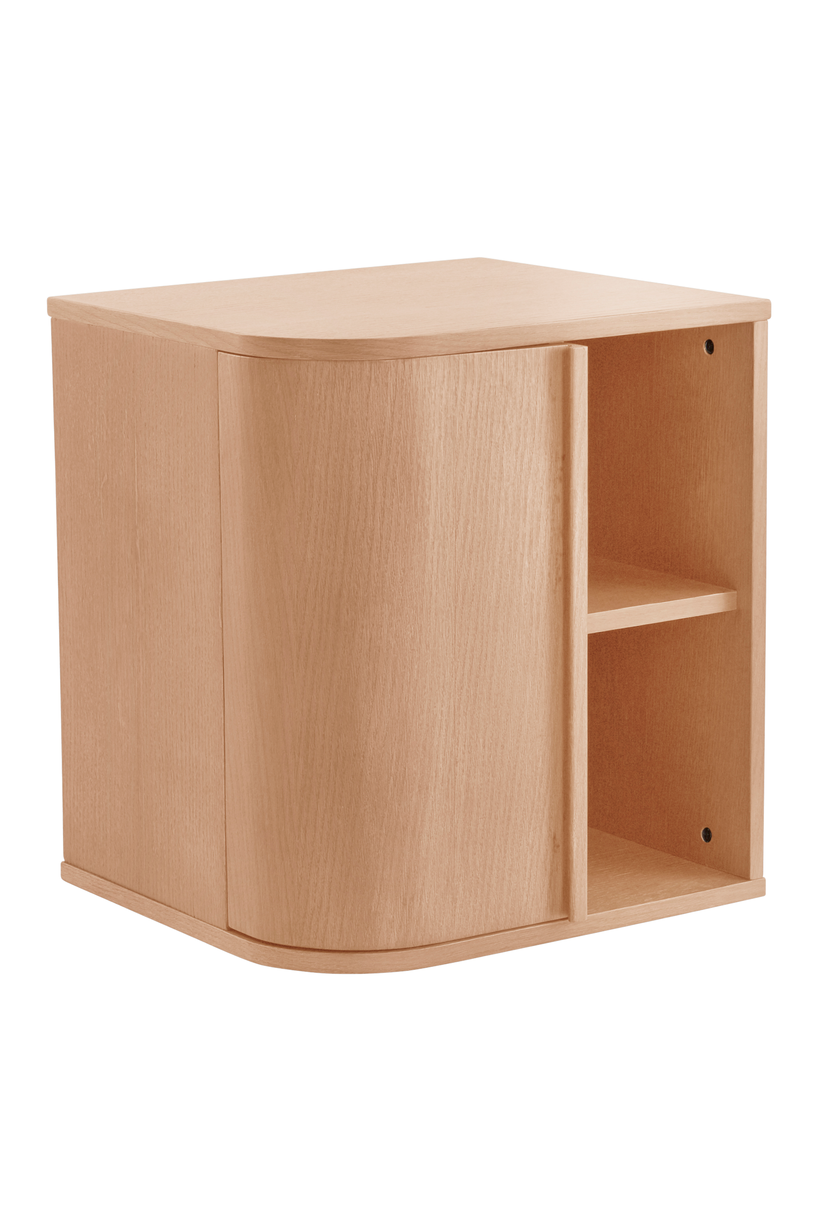 Nattbord av MDF med eikefinér på eksponerte flater. BRAUX er et flott nattbord som oser luksus og stil. Mykt avrundede hjørner i forkant forsterker den elegante følelsen. Nattbordet BRAUX har en dyp, buet dør som gir halve skapet skjult oppbevaring, og kompletteres med to åpne hyller hvor du kan oppbevare det du enkelt vil nå. Delen bak døren har også en fast hylle slik at du totalt har fire rom til praktisk oppbevaring. Nattbordet er behandlet med vannbasert lakk. Noe montering kreves. Monteringsanvisning medfølger.