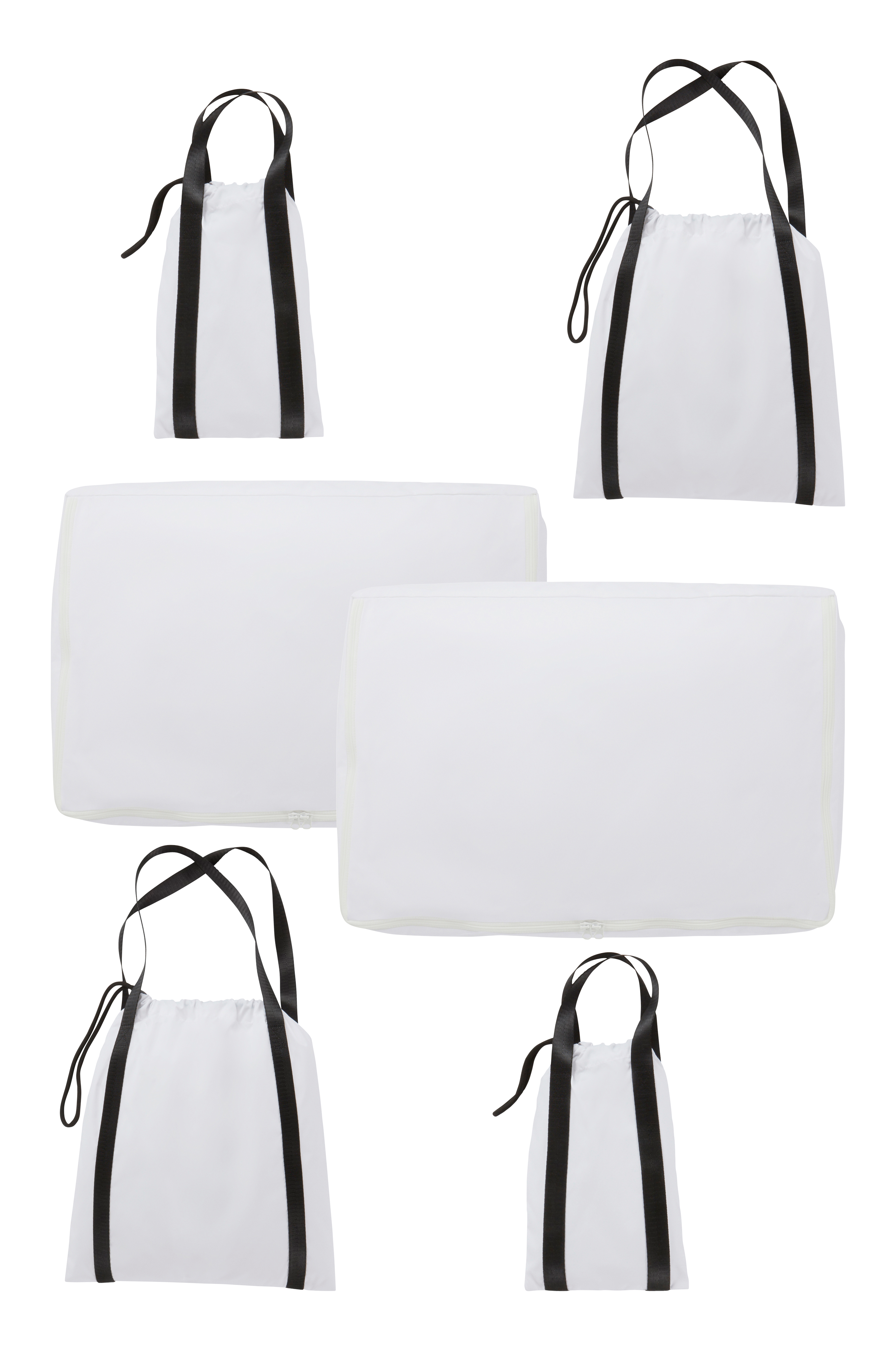 Reisesett med 6 vesker i tre ulike størrelser, perfekte å pakke i og deretter legge i kofferten. Veskene er av polyamid hvorav halvparten kommer fra gjenvunnet materiale. De er vannavvisende gjennom en behandling som er bedre for miljøet. Den største vesken lukkes med glidelås, de to modellene med håndtak lukkes med snor. Hvert sett inneholder seks vesker i tre ulike størrelser, to av hver størrelse.