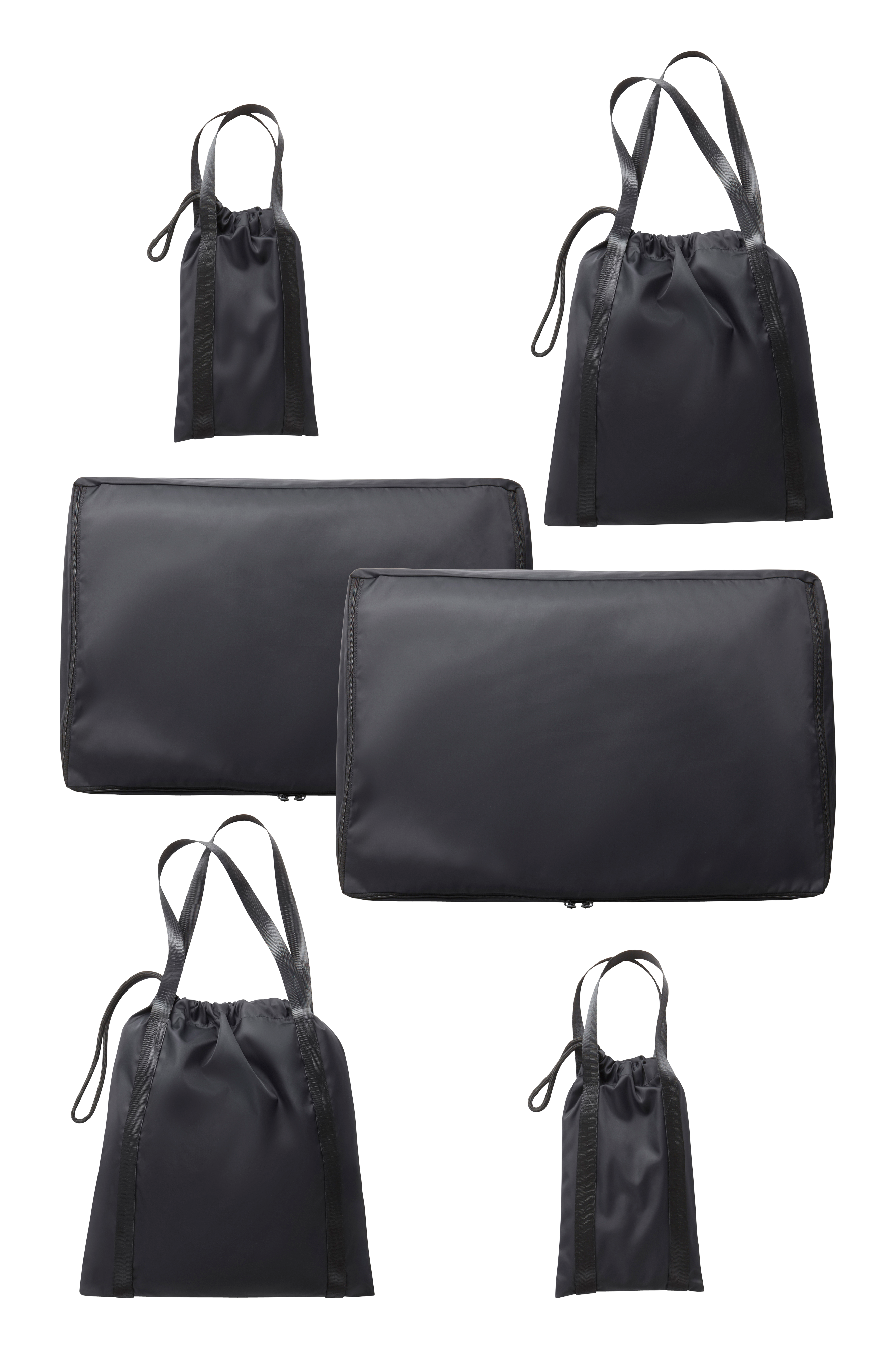 Reisesett med 6 vesker i tre ulike størrelser, perfekte å pakke i og deretter legge i kofferten. Veskene er av polyamid hvorav halvparten kommer fra gjenvunnet materiale. De er vannavvisende gjennom en behandling som er bedre for miljøet. Den største vesken lukkes med glidelås, de to modellene med håndtak lukkes med snor. Hvert sett inneholder seks vesker i tre ulike størrelser, to av hver størrelse.