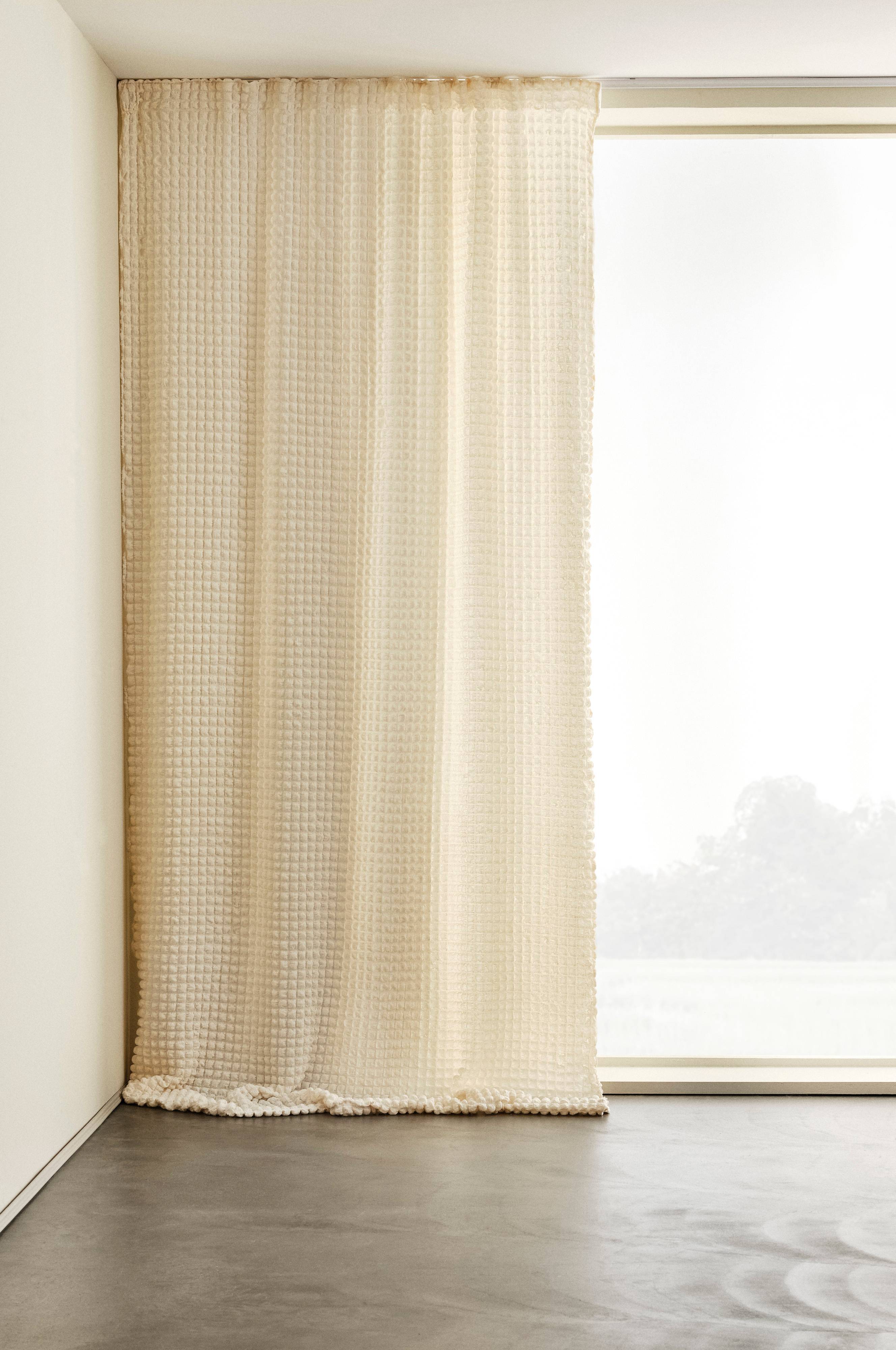 En gardinlengde i et boblete, oppsiktsvekkende stoff av polyester med iblandet spandex. Kvaliteten i kombinasjon med veveteknikken gir stoffet den lekre effekten. Det har myke bobler og er dessuten elastisk. Overlocksøm i nederkant. Lengden har påsydd multifunksjonsbånd, og kan henges opp med fingerkroker, kanal samt skjult hempe.