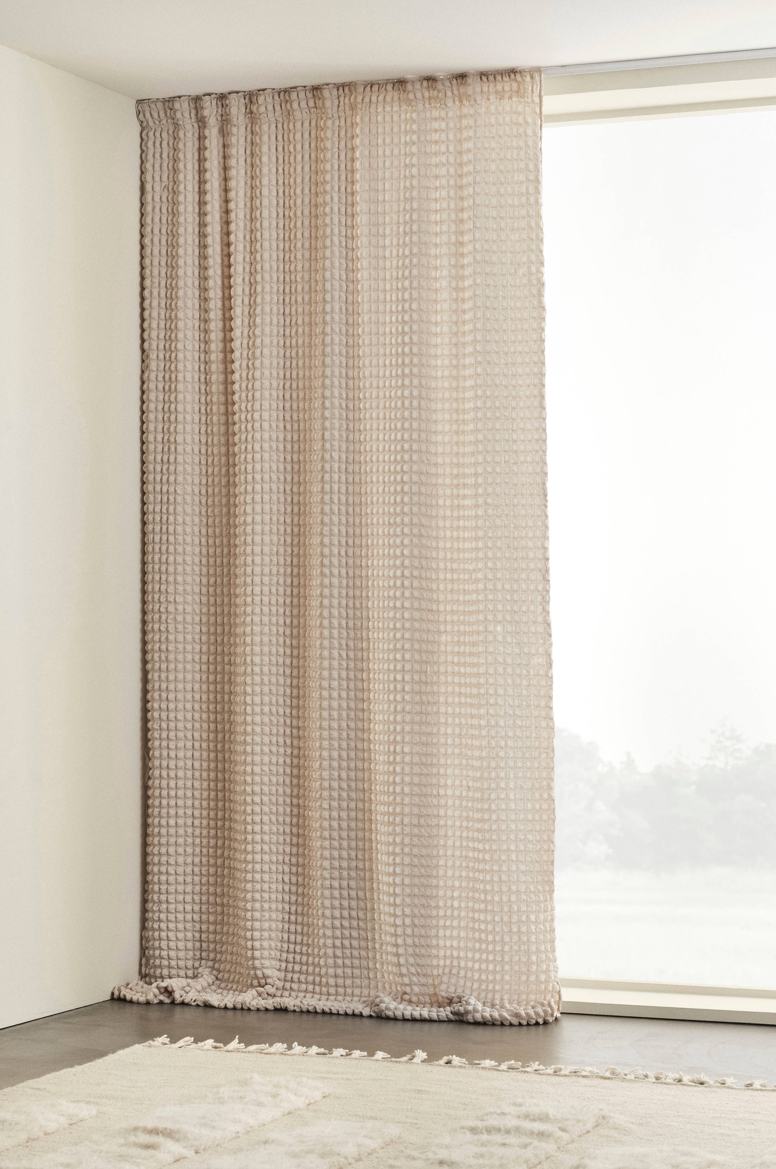 En gardinlengde i et boblete, oppsiktsvekkende stoff av polyester med iblandet spandex. Kvaliteten i kombinasjon med veveteknikken gir stoffet den lekre effekten. Det har myke bobler og er dessuten elastisk. Overlocksøm i nederkant. Lengden har påsydd multifunksjonsbånd, og kan henges opp med fingerkroker, kanal samt skjult hempe.
