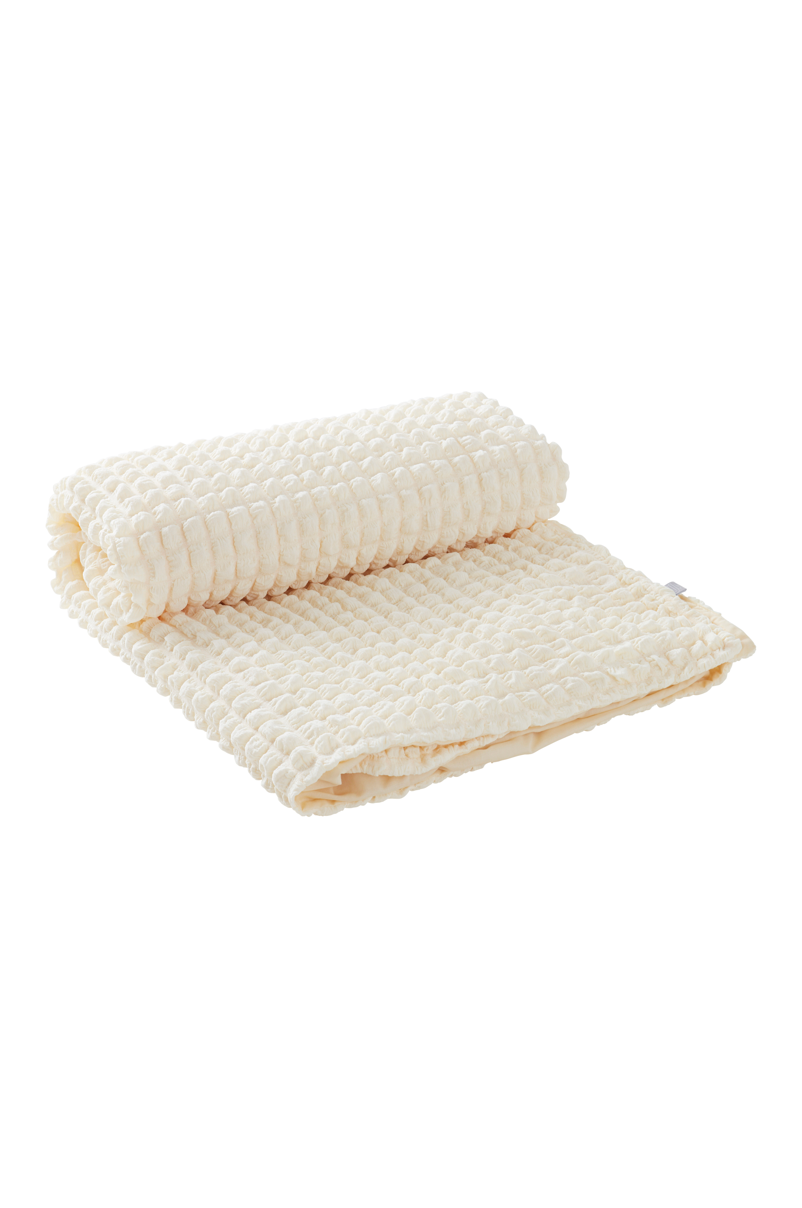 Pledd i et boblete, oppsiktsvekkende stoff av polyester med iblandet spandex. Kvaliteten i kombinasjon med veveteknikken gir stoffet den lekre effekten. Det har myke bobler og er dessuten elastisk. Pleddet er fôret med et vevd stoff, ton-i-ton med forsiden.