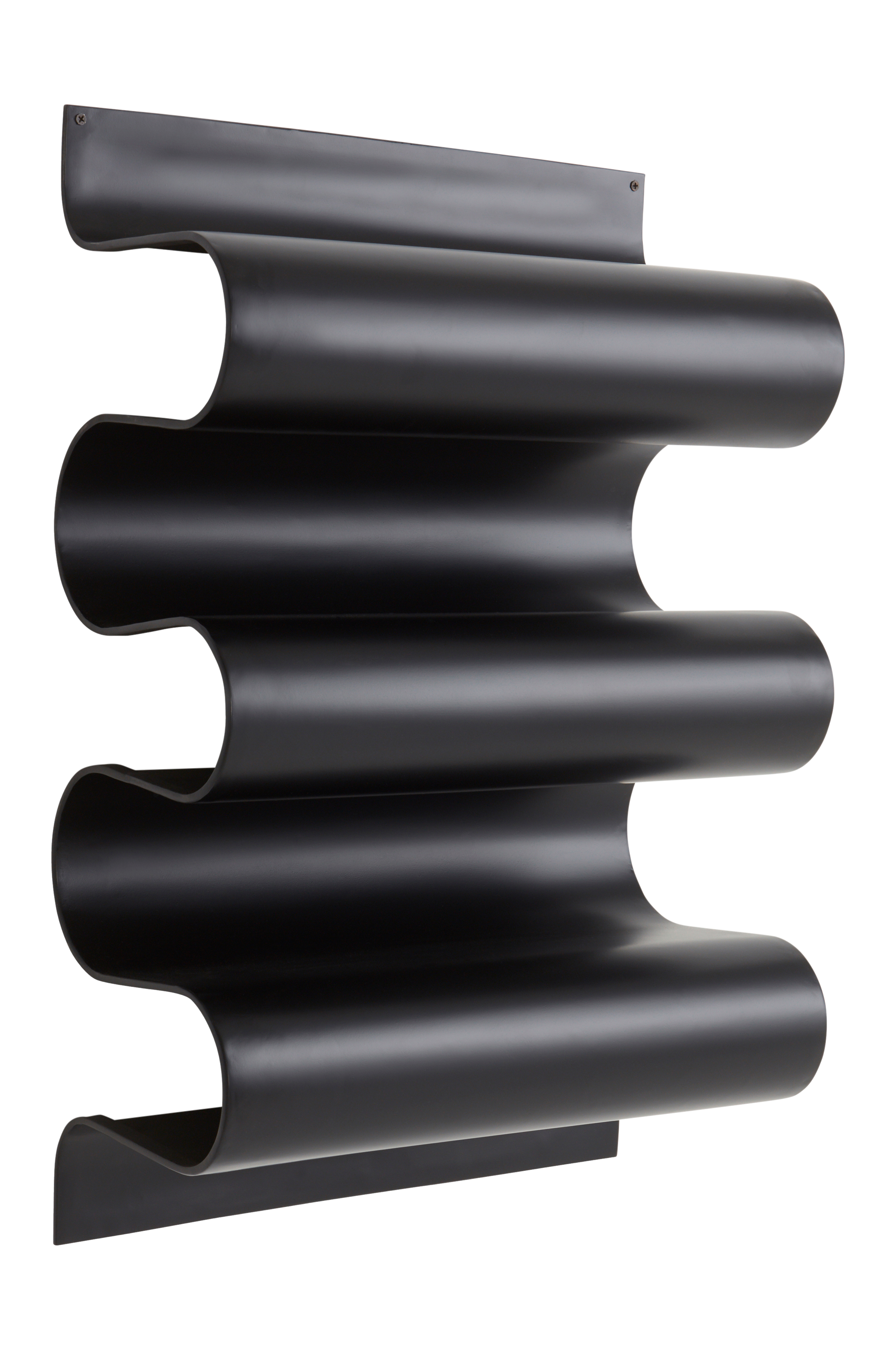Utrolig lekker og svært spesiell hylle av jern som er malt helsvart. Hyllen bølger ut fra veggen og gir spennende oppbevaring - du kan være svært kreativ i innredningen. Diskre hull i hjørnene for oppheng (skruer medfølger ikke).