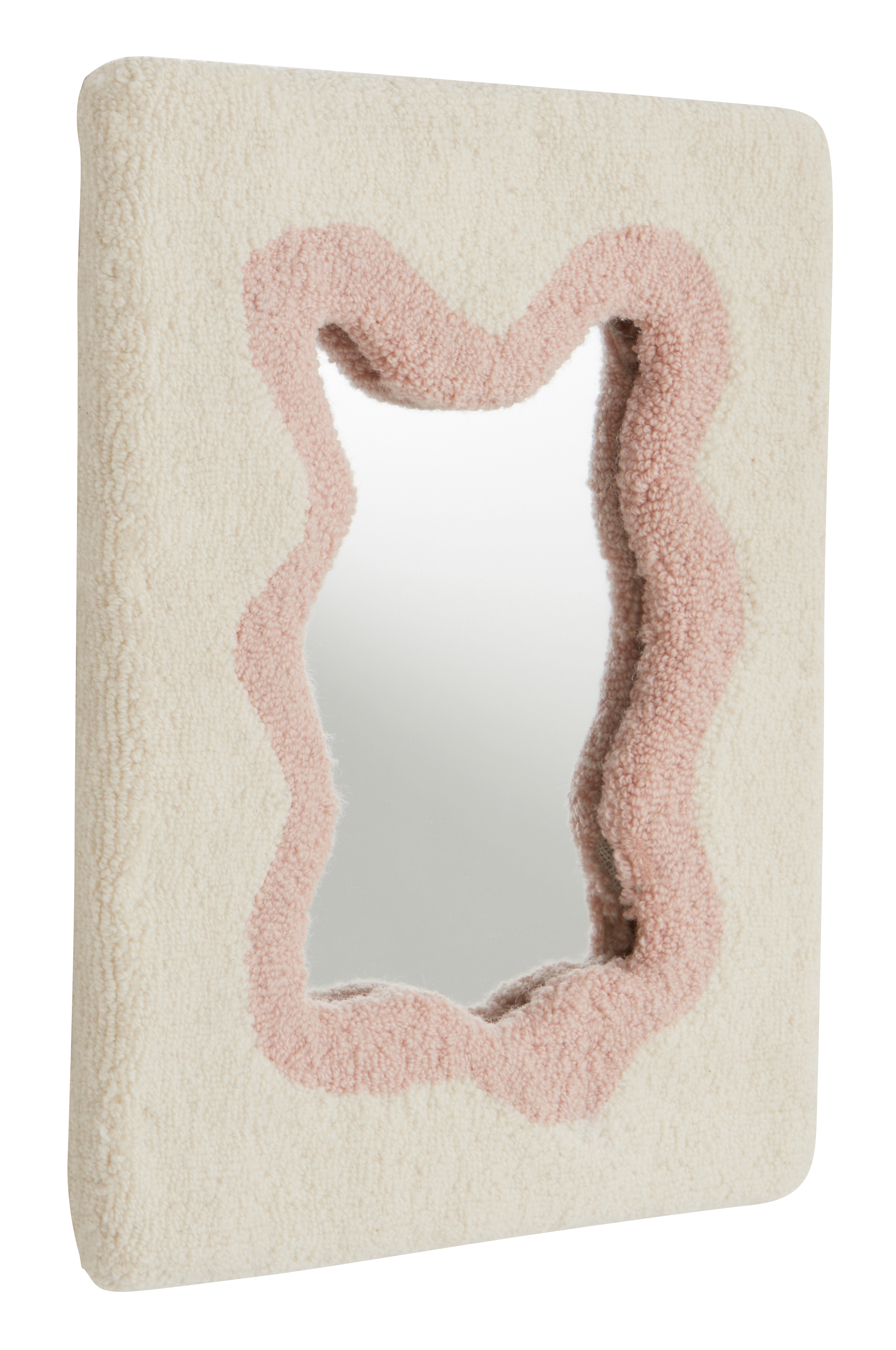 Speil med lekker ramme av MDF som er kledd med luggteppe av ull. Rammens innerkant har organisk, myk form, og luggteppet som kler rammen er tofarget. Speilet kan henges både stående og liggende, hva som enn passer deg best. Baksiden er av MDF.