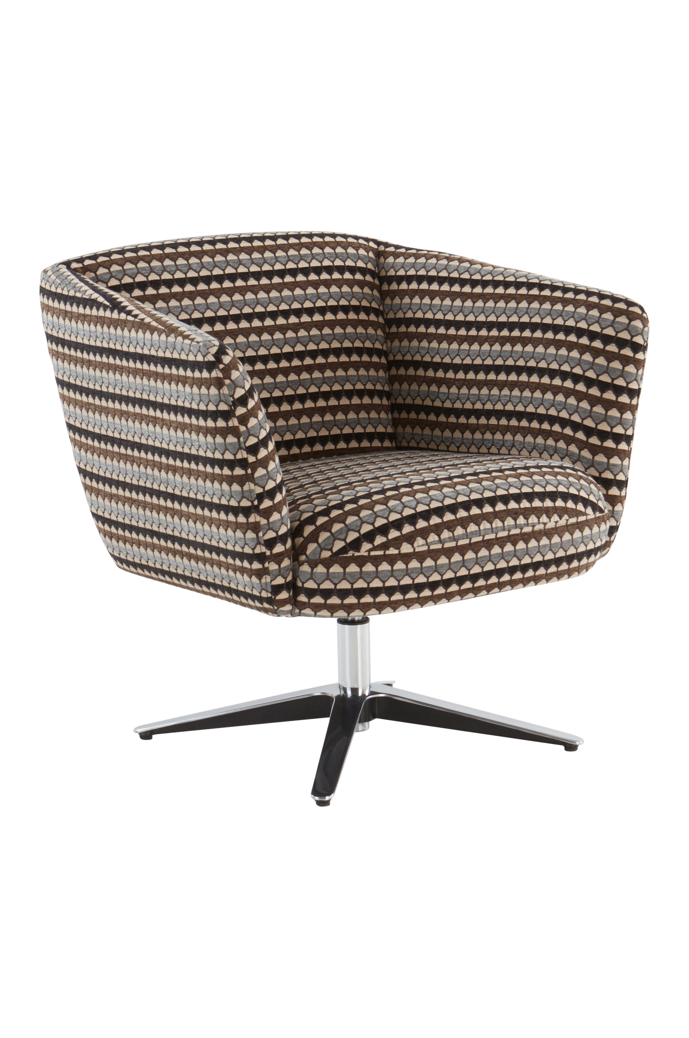 BURLEY er en svingstol i litt lav modell med trekk som gir velfortjent oppmerksomhet. Stoffet er utrolig detaljert og fint, det har vevd mønster med horisontale striper i jordnære farger. Trekket er et solid polyesterstoff med slitestyrke på 40 000 Martindale. Du sitter komfortabelt siden BURLEY har myk og smidig polstring av skum. Stammen er av FSC-sertifisert furu og kryssfiner. BURLEY har et lite hint av retro, mye takket være den forkrommede snurrefoten. Noe montering kreves. Monteringsanvisning medfølger.