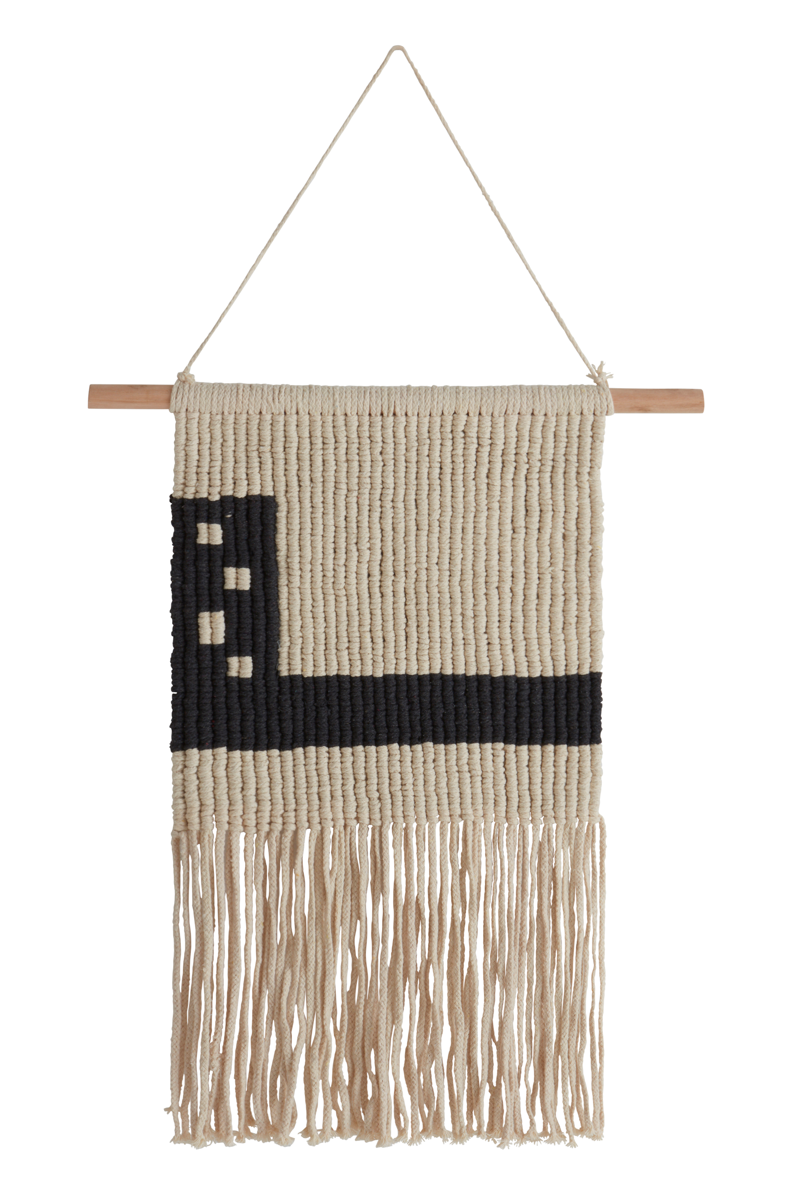Vevd veggdekor av bomull og med trestav øverst. Veggpryden er vevd i grovt garn, og har lang frynsekant nederst. Opphenget består av en trestav med snor i ytterkantene.