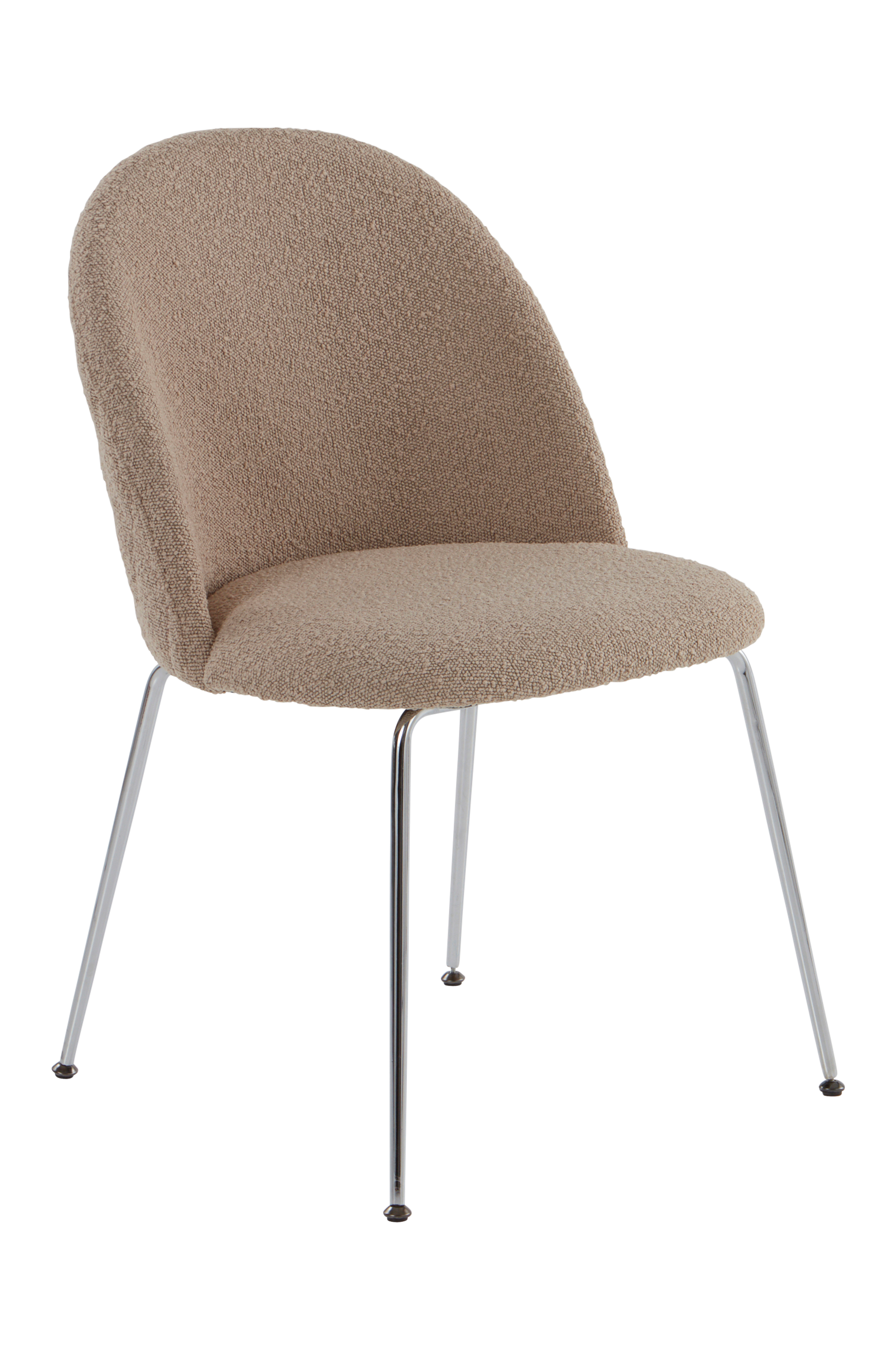 2-pakning med stoler med trekk i fint strukturert bouclestoff og forkrommede, lett utsvungne stålben. Ryggstøtten har dekorative quiltsømmer, noe som gjør stolen ekstra stilig ved spisebordet. Både rygg og sete er komfortabelt polstret med polyesterskum på en ramme av kryssfiner. CALLAHAN er en komfortabel stol som passer utmerket til lange, koselige middager, og det er lett å sitte lenge i den.