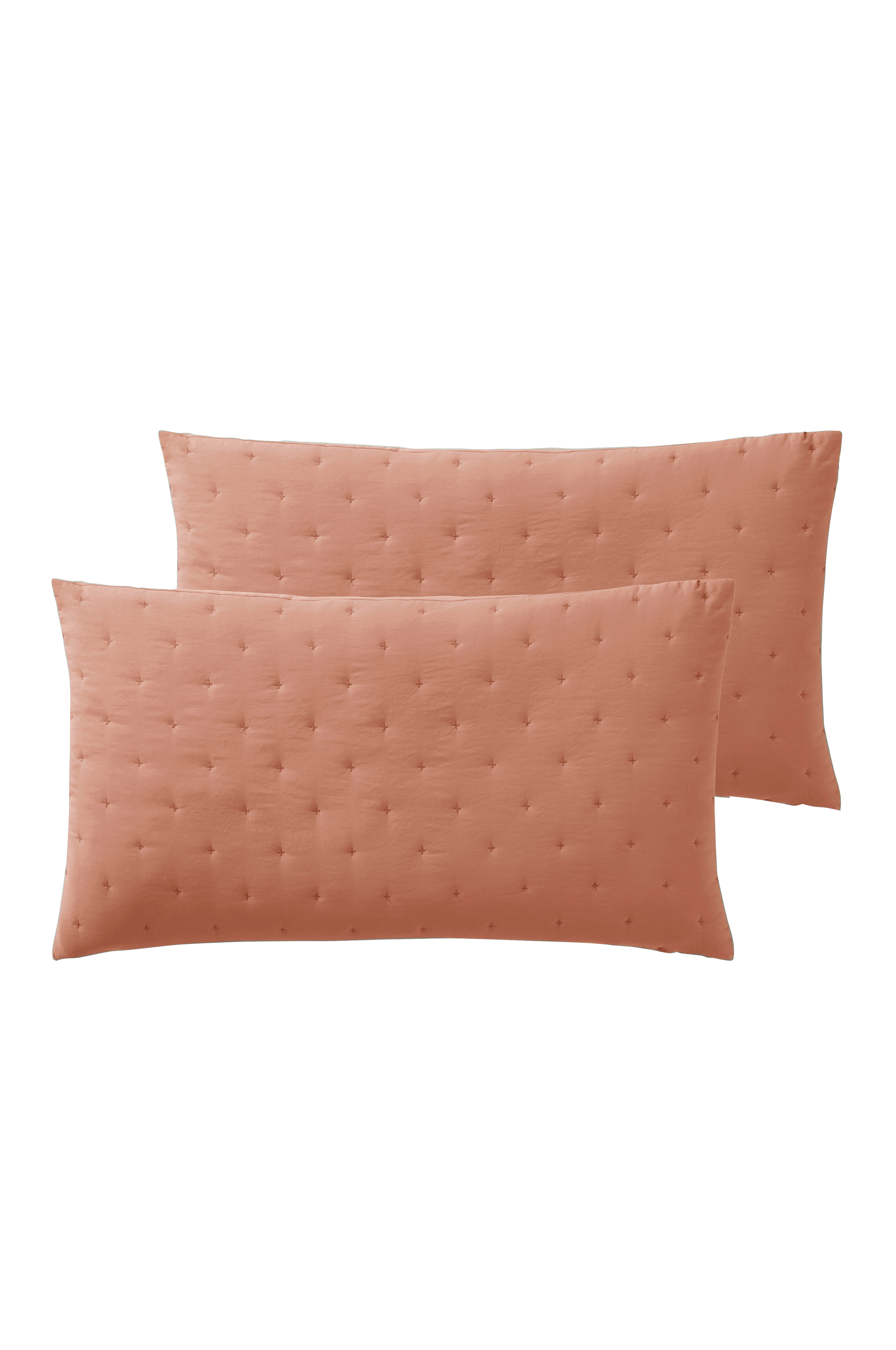2-pk putetrekk sydd i myk polyester som er vasket for å få en deilig følelse. Putetrekkene har enkel quilting av broderte, små kryss som danner et diskre mønster på forsiden. Stoffet har en lett vattering som holdes på plass av quiltingen. Baksiden er glatt. Skjult glidelås på baksiden.