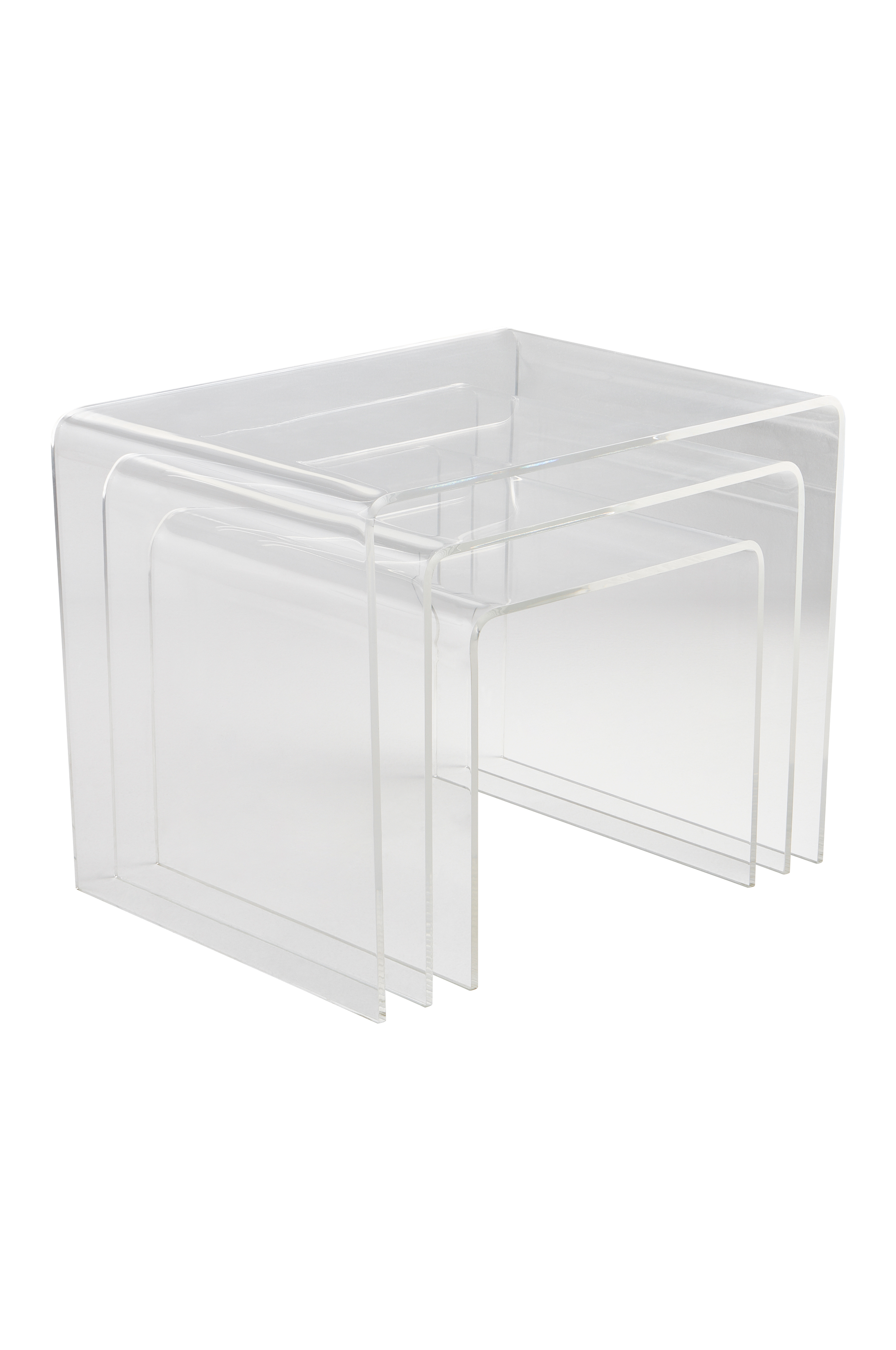 3-pk sidebord av akrylglass. Du får tre bord i ulik størrelse, men med samme farge. Velg å ha dem sammen i gruppe eller forgylle ulike rom i hjemmet. Det U-formede bordet går i ett stykke med mykt avrundet hjørner uten skjøter, og gir en herlig, futuristisk følelse. CATALINA er svært anvendelig som sidebord, nattbord eller entrebord. Trioen sammen blir et fint og fleksibelt sofabord. Vil du spare plass kan bordene plasseres under hverandre, de er stabelbare. Perfekt når man har liten plass.