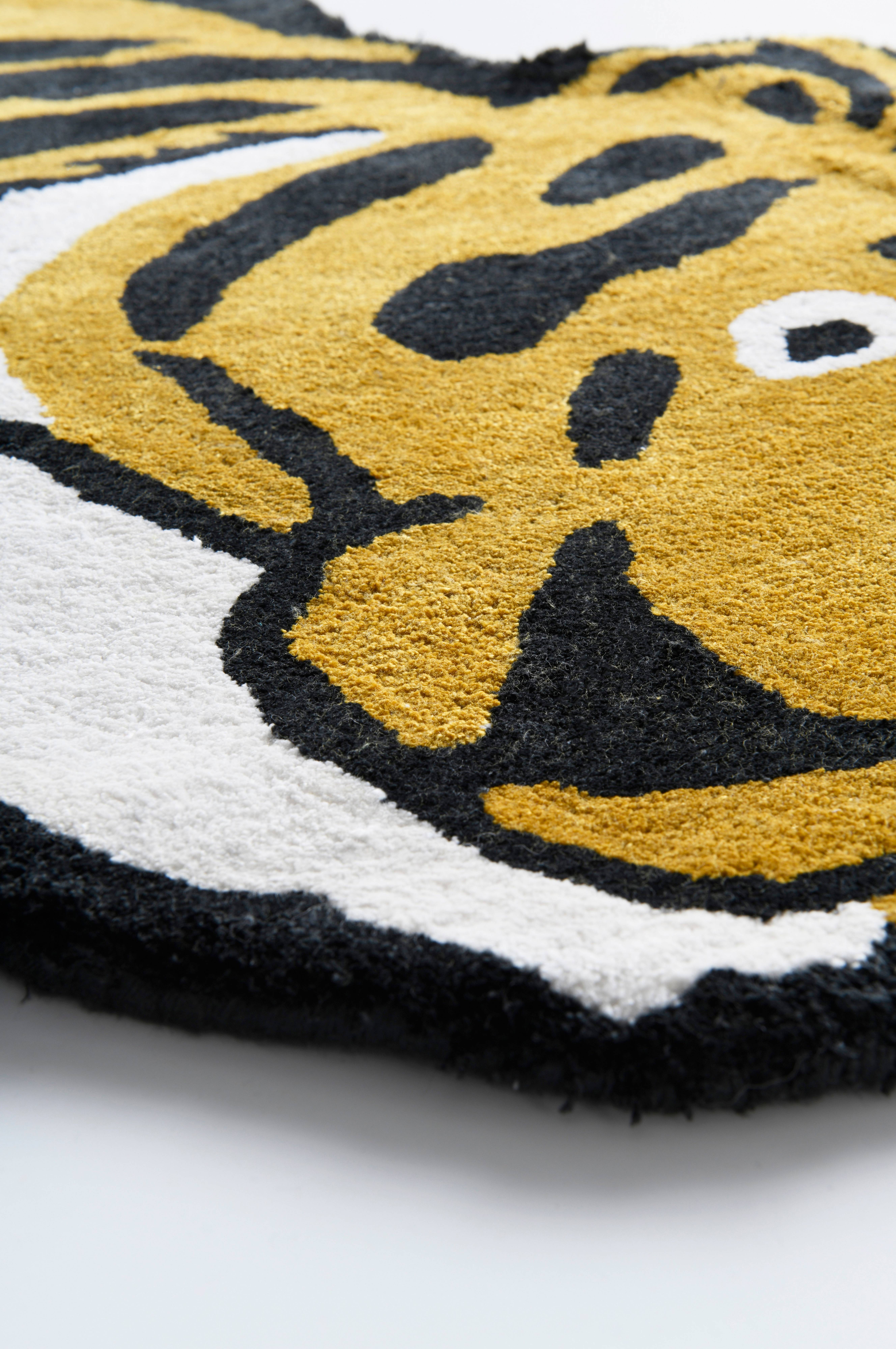 Viskoseteppe med kort lugg og vevd motiv. Lugghøyde 0,8-1 cm. 4600 g/m². Det håndtuftede teppet er formet som en tiger, og blir en morsom detalj på barnerommet - mykt og varmt å sitte og leke på.