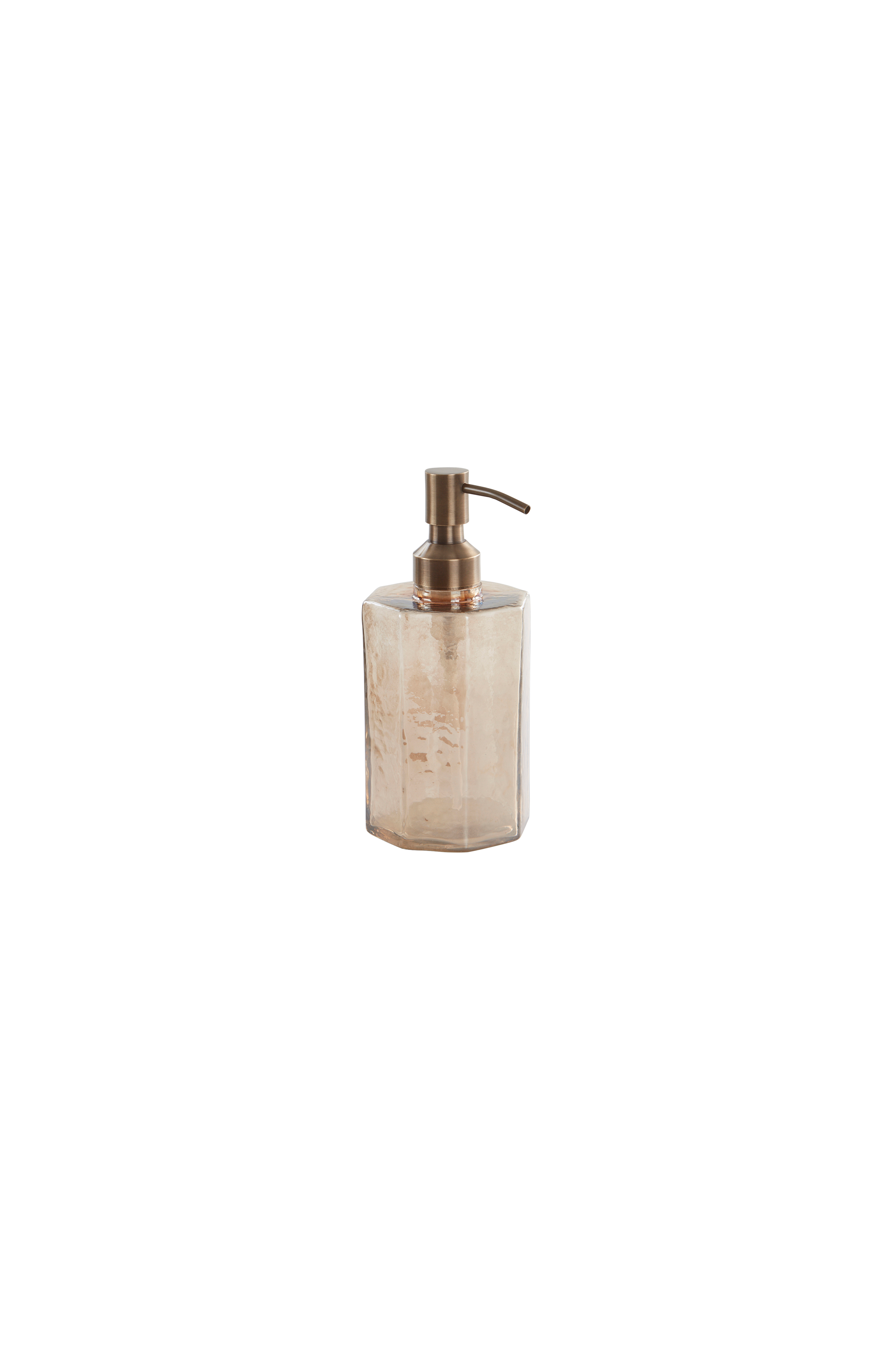 Såpepumpe av glass med pumpe av messing og plast. Beholderen er åttekantet, og det hamrede glasset har en tekstur som gir en håndblåst følelse. Pumpen skrues lett av for påfyll av flytende favorittsåpe.