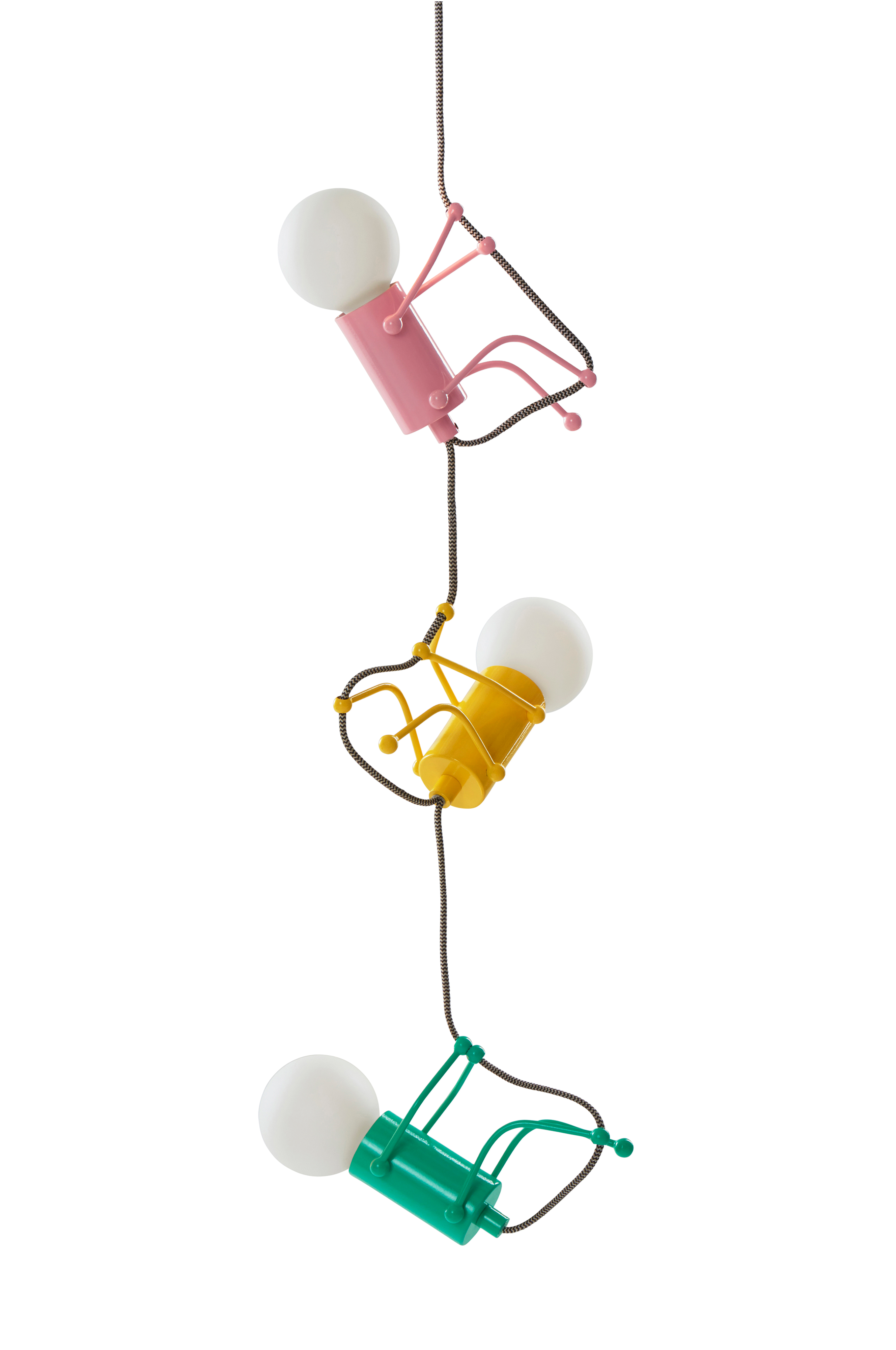 Taklampe i metall. Tre fantasifigurer i pigge knallfarger klatrer opp på den svarthvite tekstilledningen. De tre lyskildene kan forandre lampen avhengig av hvilke pærer du velger. Ledningslengde 1,2 m.