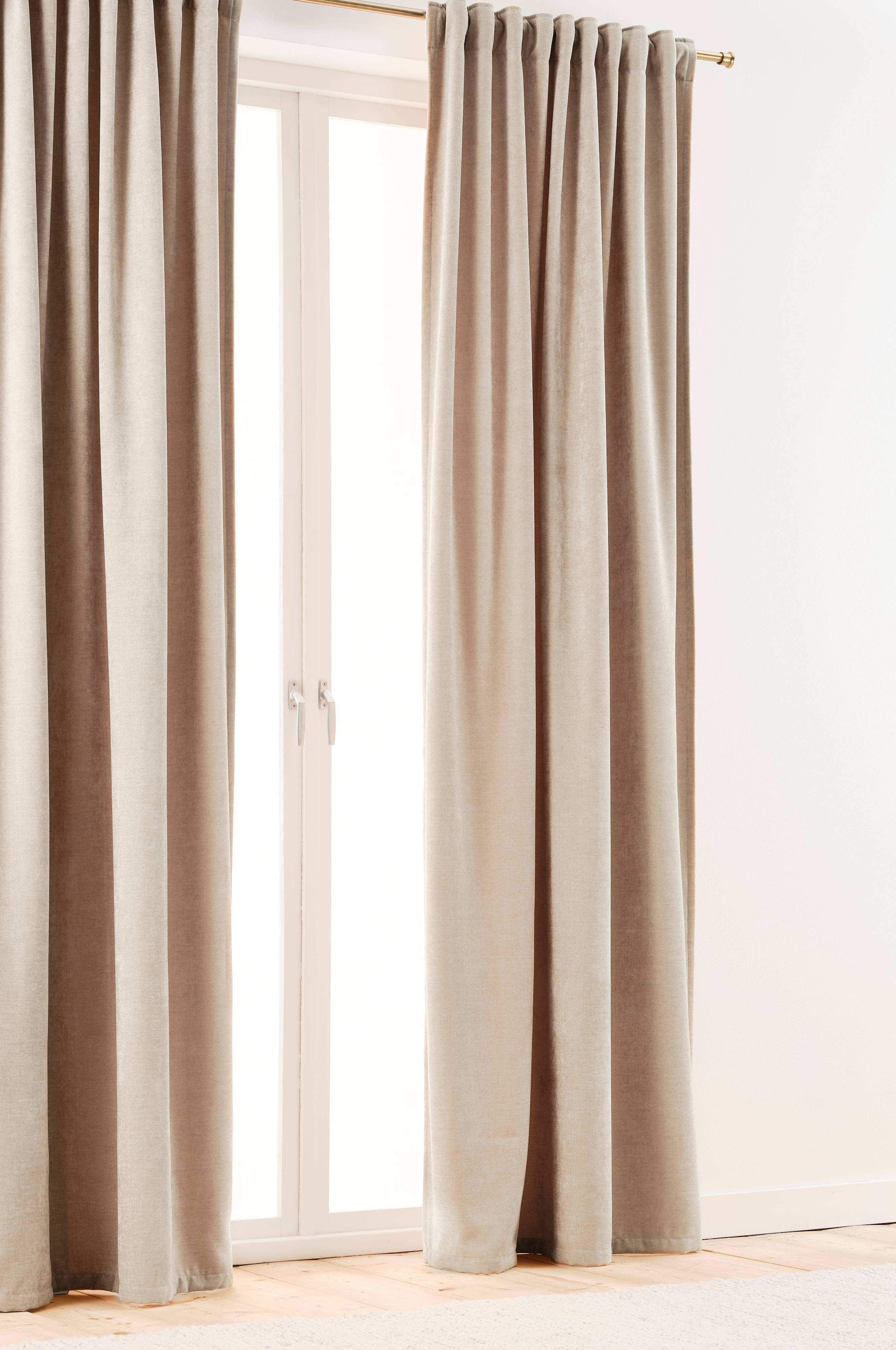 2-pk gardinlengder i ensfarget chenille med fin struktur. Med påsydd multifunksjonsbånd. Gardinen kan henges opp med fingerkroker, løpegang eller skjult hempe.