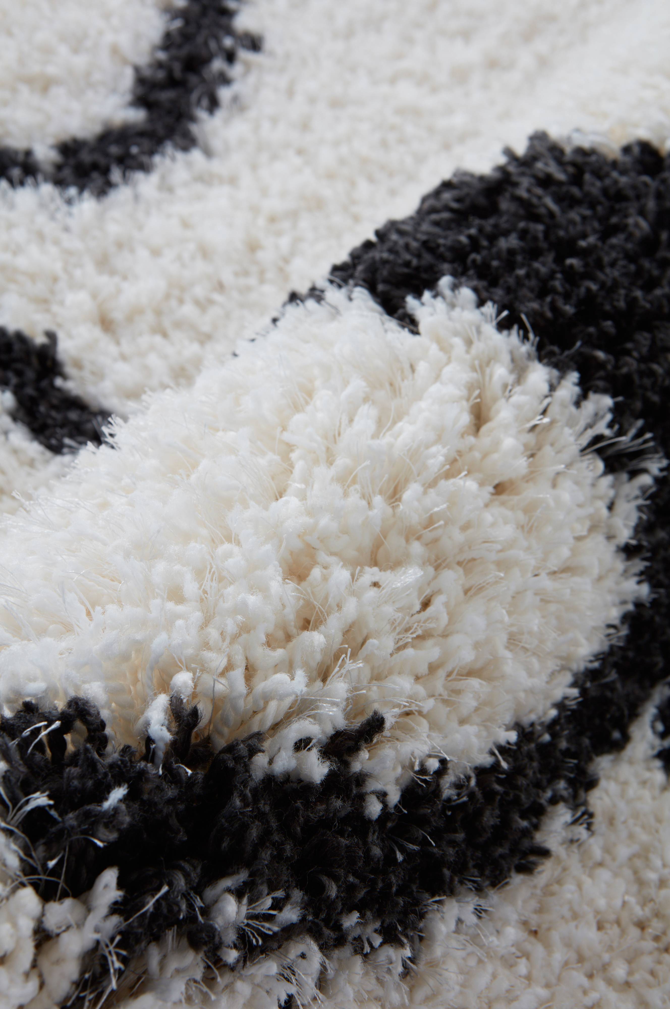 Luggteppe med grafisk mønster på lys bunn, kanskje mønsteret kan bringe tankene til månen i ulike varianter. Teppet har tett, deilig lugg med en tynn, blank tråd iblandet i et mykt, luftig garn. Teppet er deilig å sitte på samtidig som det demper lyd, og passer perfekt på barnerommet. Lugghøyde 4,5 cm. Tykkelse 5 cm. 2700 g/m².