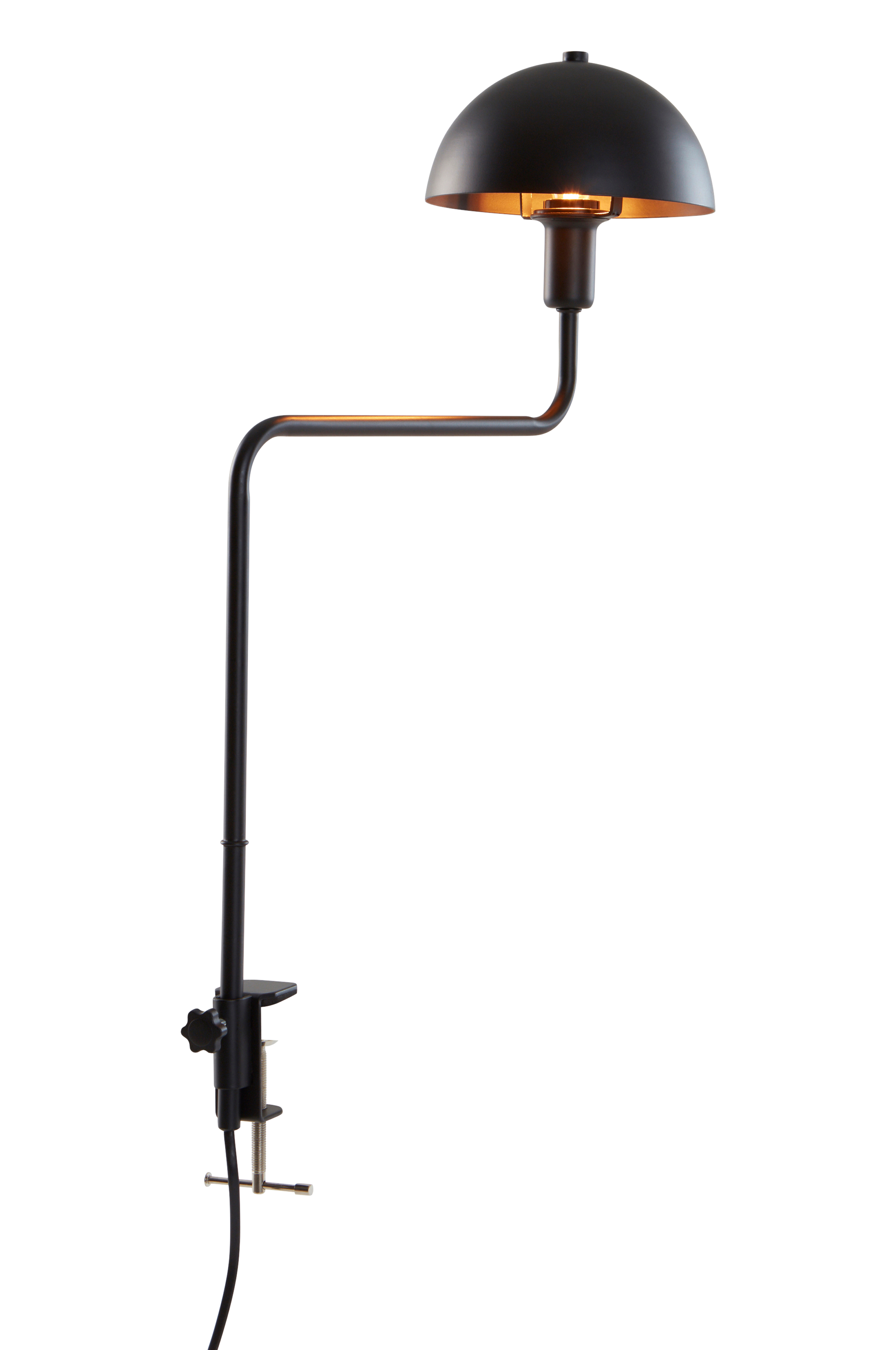Bordlampe i mattsvart jern. Bordlampen er nett og diskre, med fint formet metallkuppel som fokuserer lyset nedover uten å blende. Lampen skrus fast i bordplaten, noe som er praktisk ved skrivebordet siden lampen ikke opptar plass på arbeidsflaten. Skrutvingen som fester lampe er helt i metall, og plastledningen matcher lampens farge. Strømbryteren er plassert på ledningen. Lampen er ujordet, klasse 2.