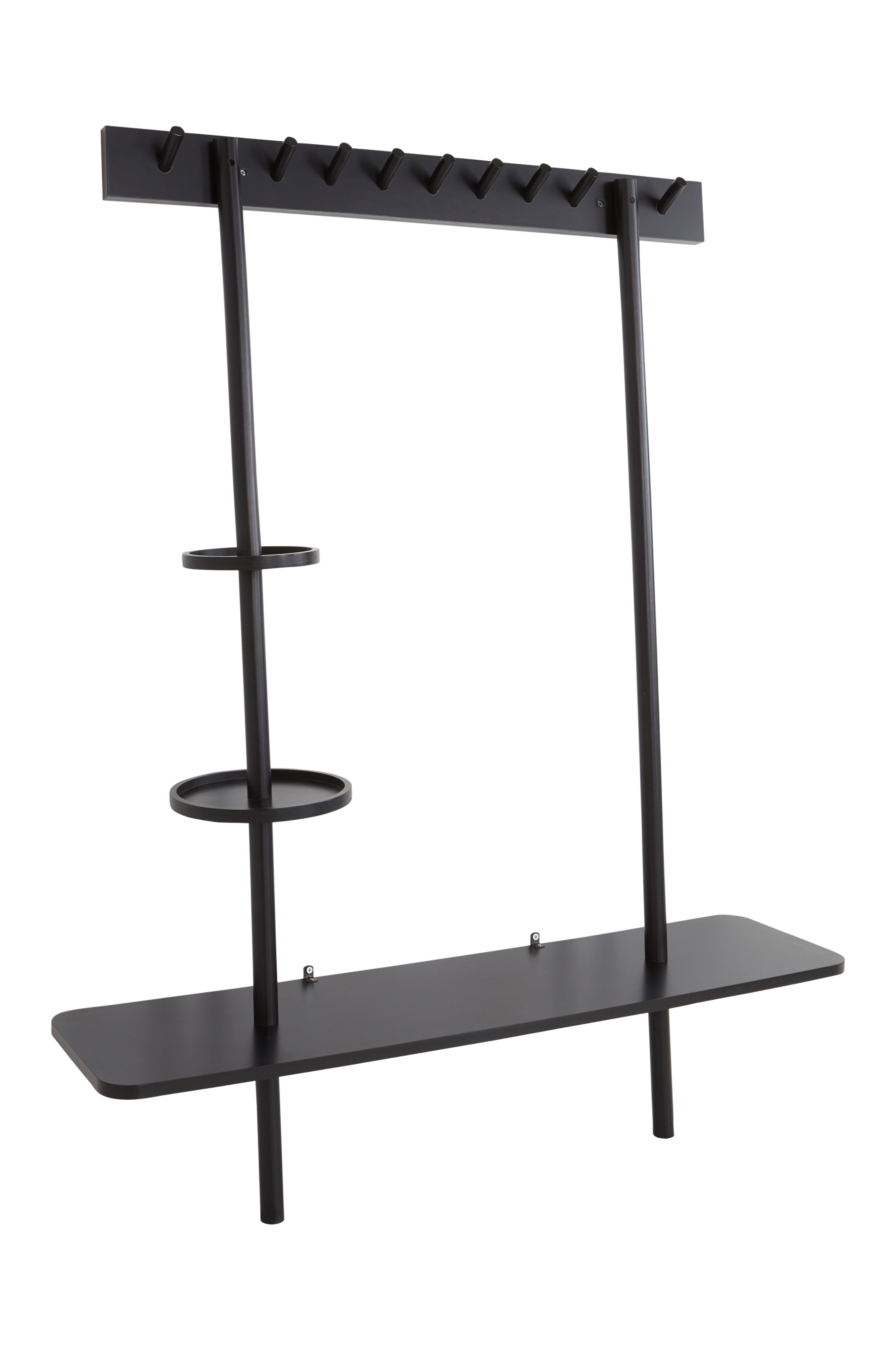 Klesstativ av MDF, svært praktisk som gangmøbel. Klesstativet har en knaggrekke øverst, to lite runde hyller til småting samt en stor hylle nederst til sko og vesker. Hyllen står lent mot veggen, og du monterer den på veggen med medfølgende skruer. CLARET er et pent klesoppheng som gjør det enkelt å få orden på klær og sko. Noe montering kreves. Monteringsanvisning medfølger.
