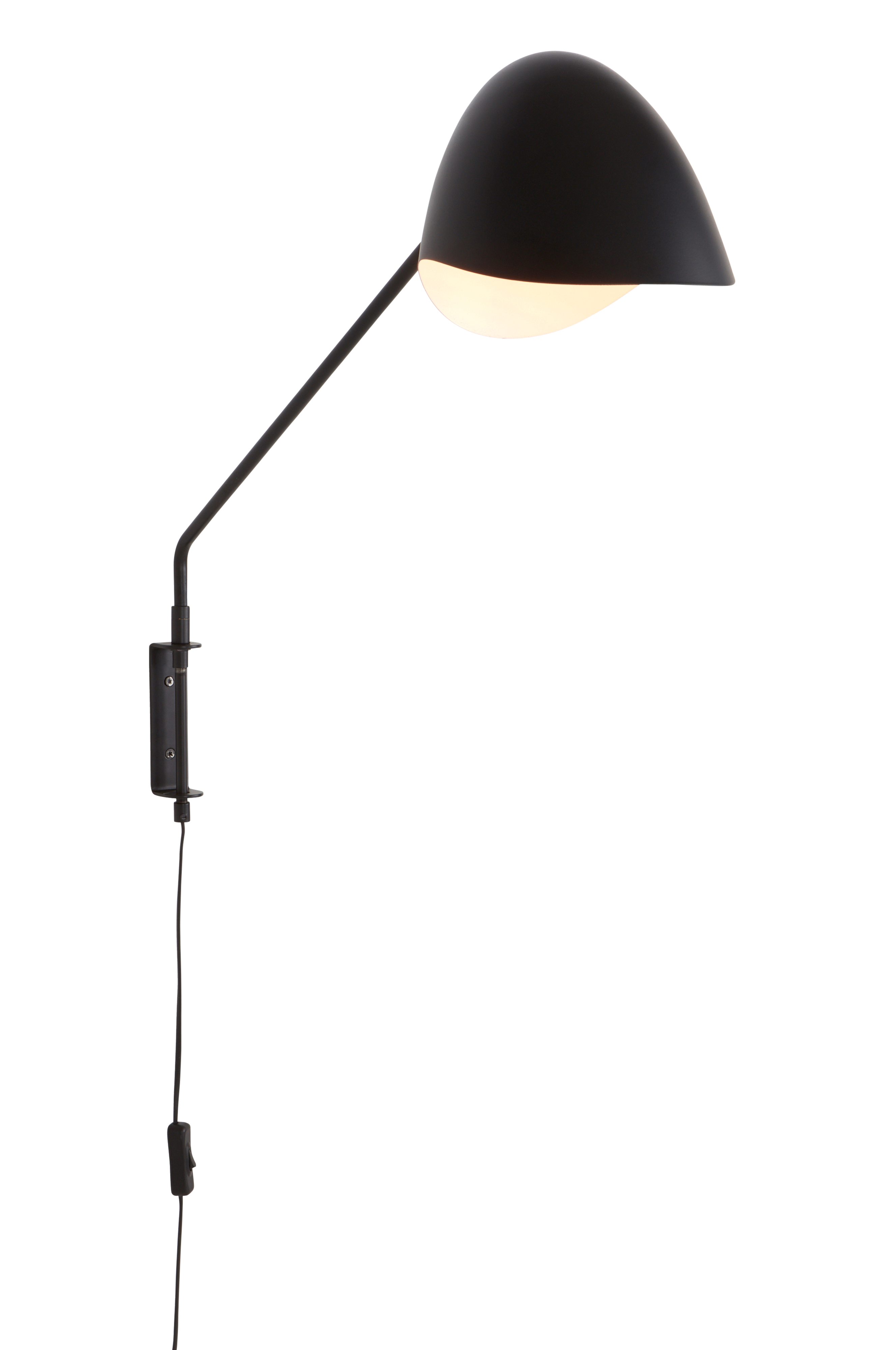 Vegglampe i metall, skjermen har blank, hvit innside som reflekterer lyset fint. Den asymmetriske skjermen er regulerbar. Ledning av plast med EU-tilpasset kontakt og strømbryter på ledningen. Lampen er ujordet, klasse 2.
