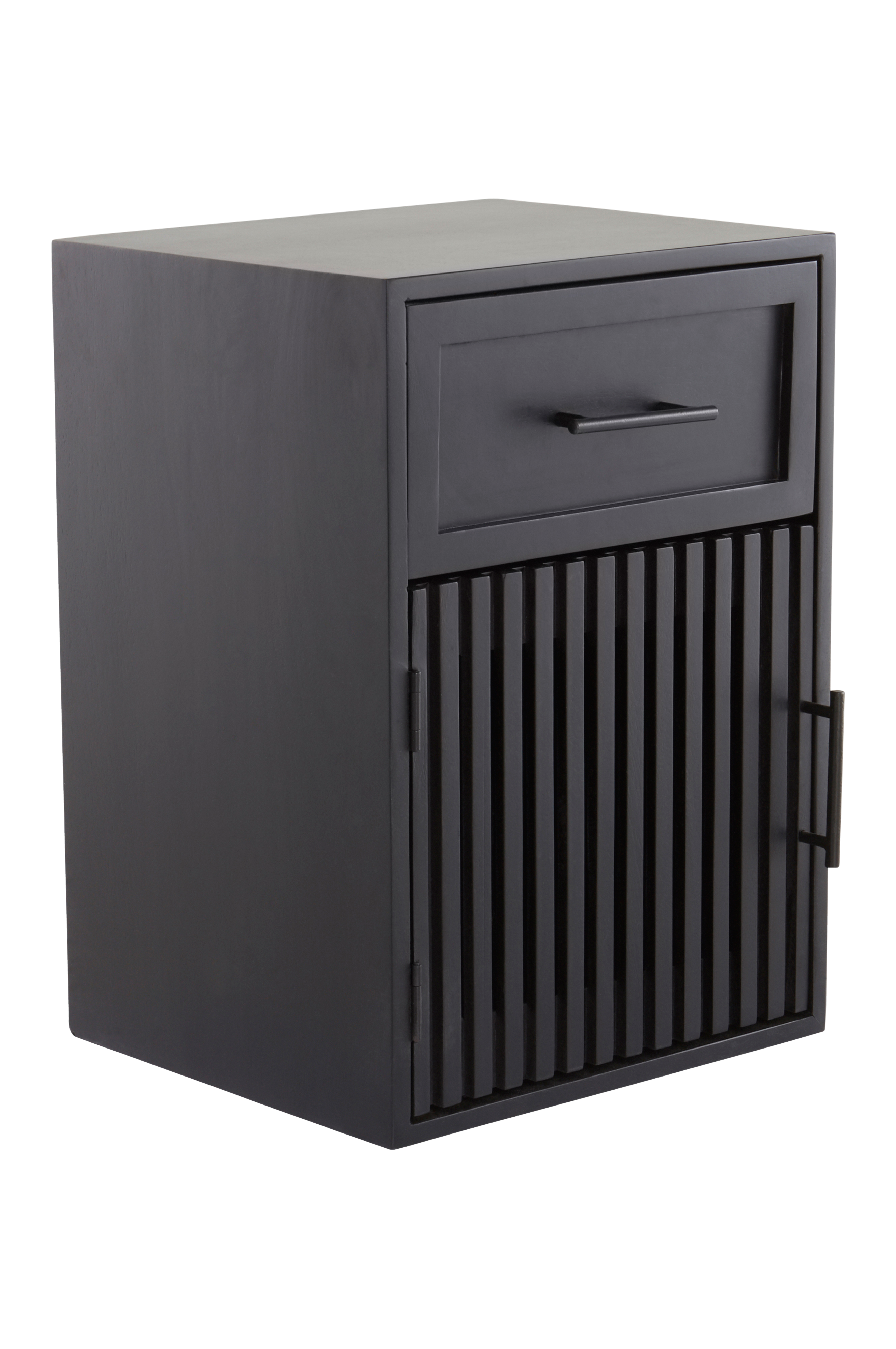 Nattbord av mangotre og MDF med matt finish. Nattbordet har en skuff øverst. Døren til skapdelen består av firkantede ribber som gir en viss gjennomsiktighet. Innvendig har skapet en fast hylle. Både skuff og dør har håndtak av metall, døren lukkes med magnetlås.