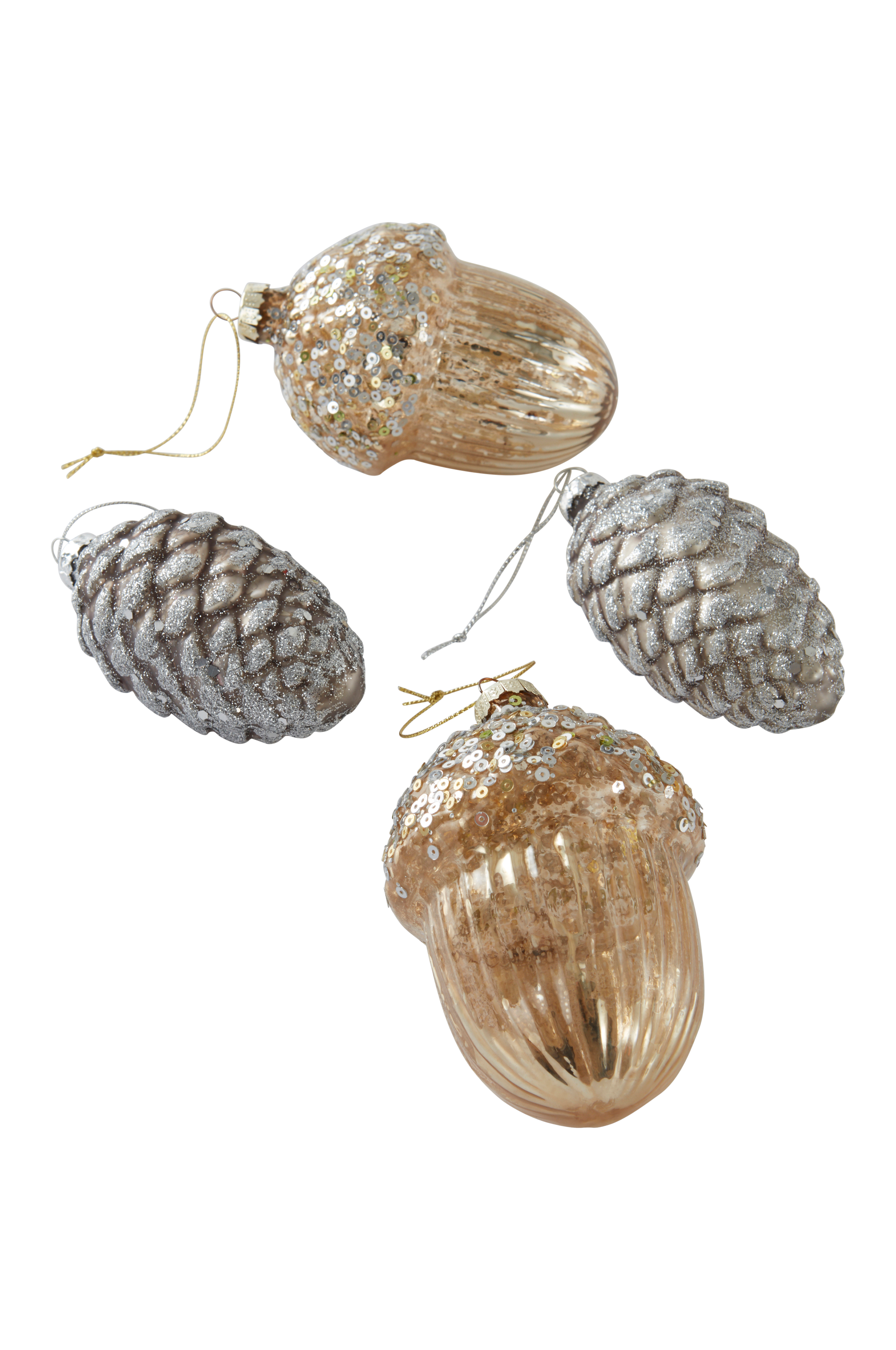 4-pk kongler og eikenøtter av glass med sølv- og gullfarget dekormaling og glittereffekter. Pakken inneholder to ulike varianter, to av hver. Alle har en liten snor slik at du kan henge de opp der du vil forgylle litt.