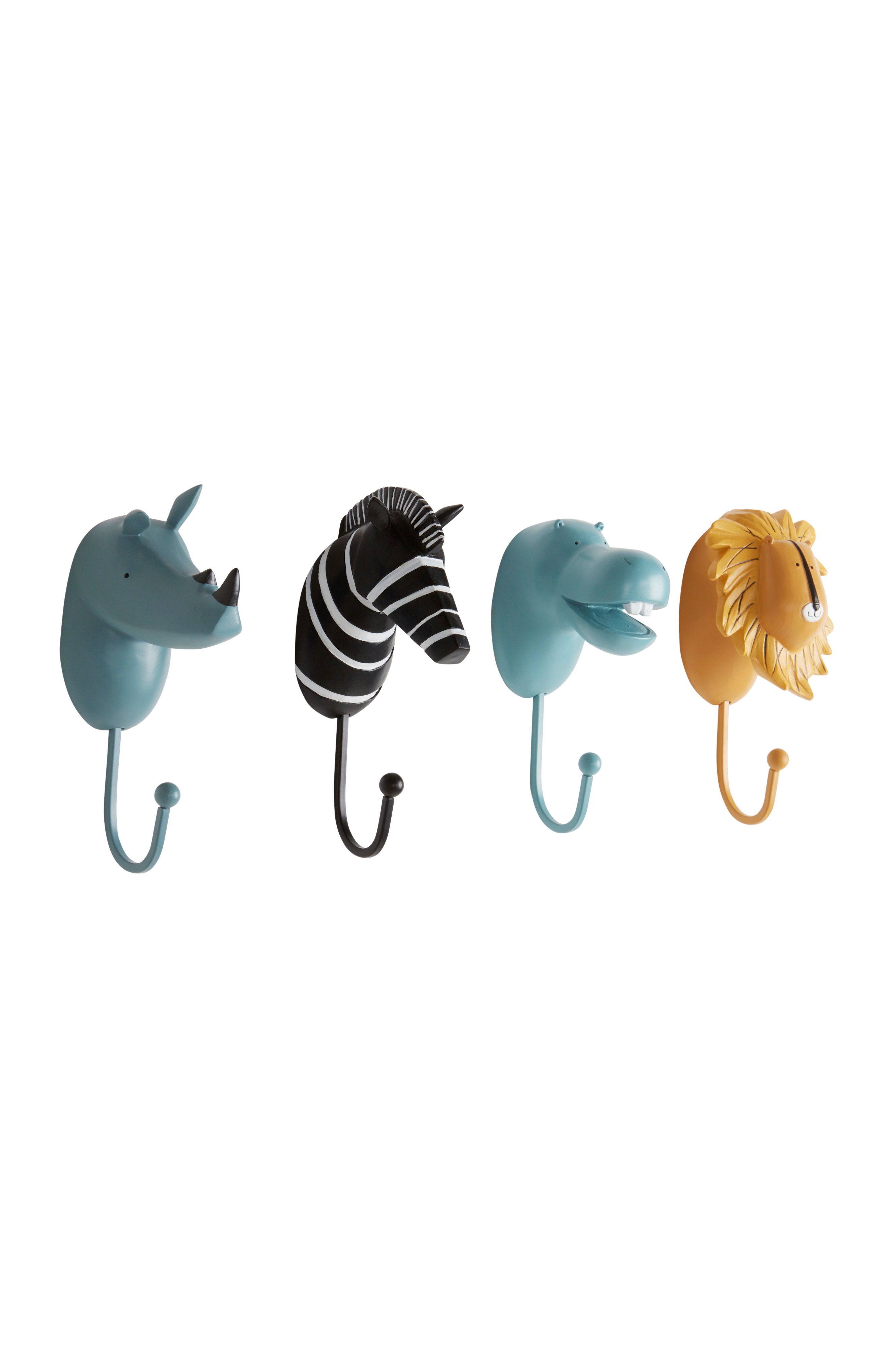 4-pk knagger med dyr av polyresin og krok av malt metall som matcher dyret. Fantasifulle dyr som forestiller en sebra, en løve, en flodhest og et neshorn i fine farger. Knaggen er ordentlig bøyd slik at klær, vesker og annet henger på plass uten å falle av.