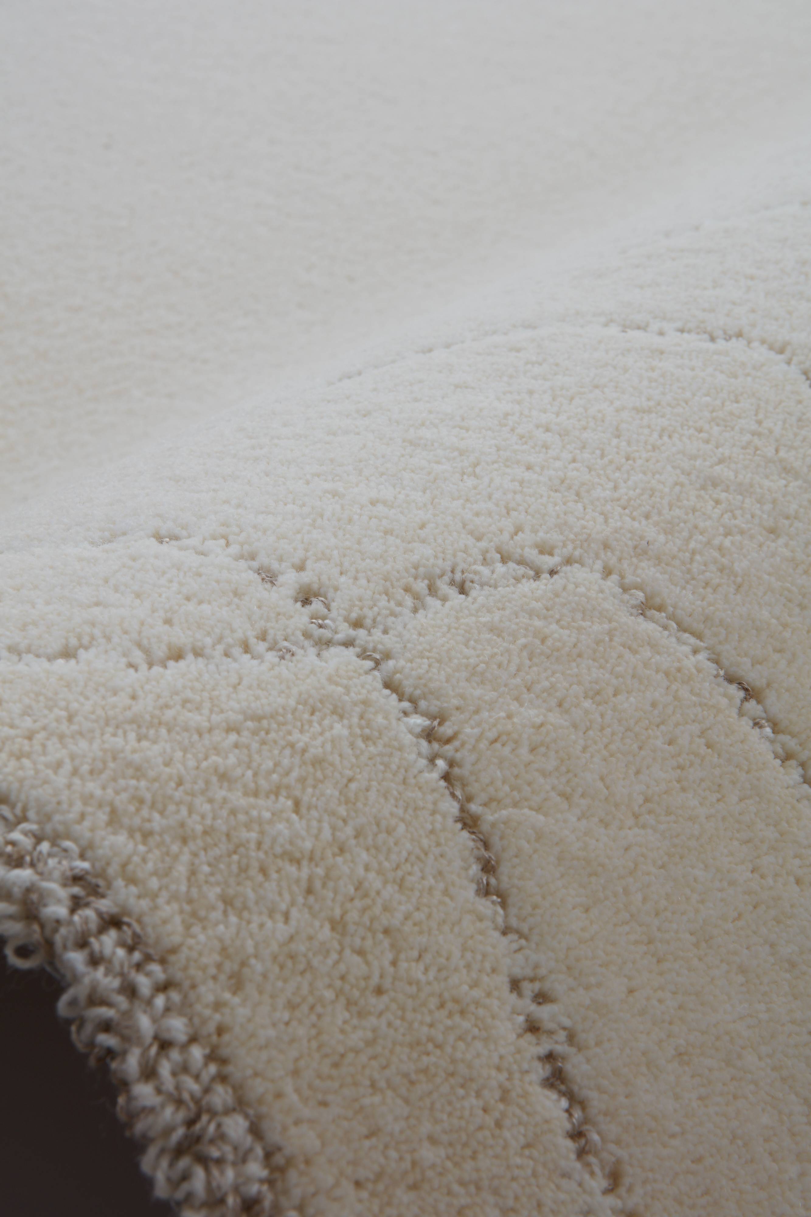 Teppet er tuftet med herlig ullgarn med litt iblandet lin. Teppet har skåret lugg i lyst garn, og løkker i litt mørkere nyanse skaper en bord langs den bølgede kanten. Borden minner om lagene som finnes i et skjell. Ullen kommer fra New Zealand og linet kommer fra Frankrike. Både ull og lin er fine naturmaterialer. Ull varmer på en deilig måte og er naturlig smussavvisende.