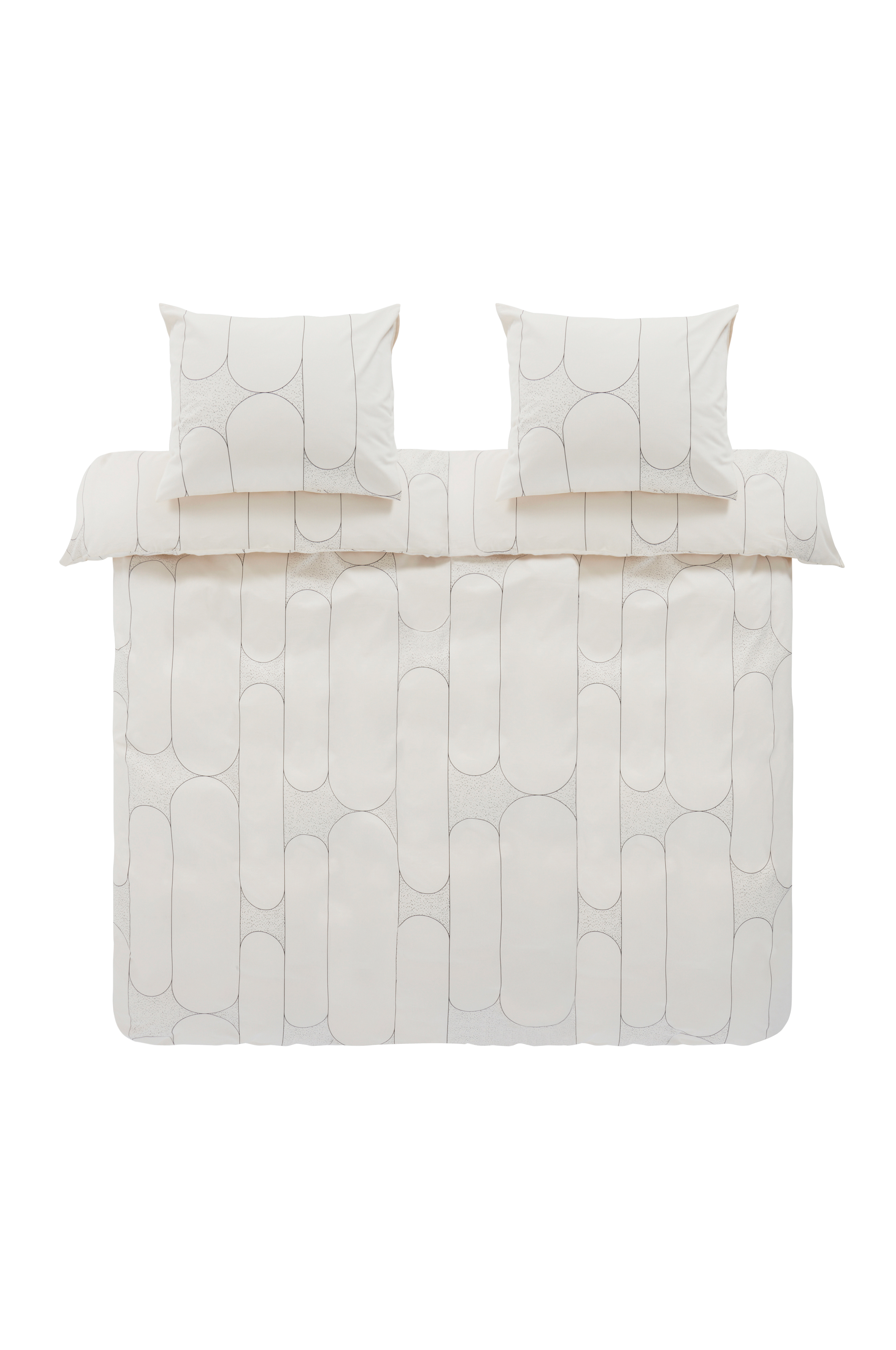 Sengesett i tre deler, et ekstra bredt dynetrekk og to putevar av bomull med trykt, diskret mønster. Bomull i sengetøy gir en behagelig følelse, mykt og litt svalt. Åpning øverst i hjørnene på dynetrekket. Det gjør det lettere å tre dynetrekket over dynen. Trådtetthet på 144 tc. (Trådtettheten forteller om antallet tråder, thread counts, pr. kvadrattomme i et stoff. Jo høyere trådtetthet, desto høyere kvalitet.)