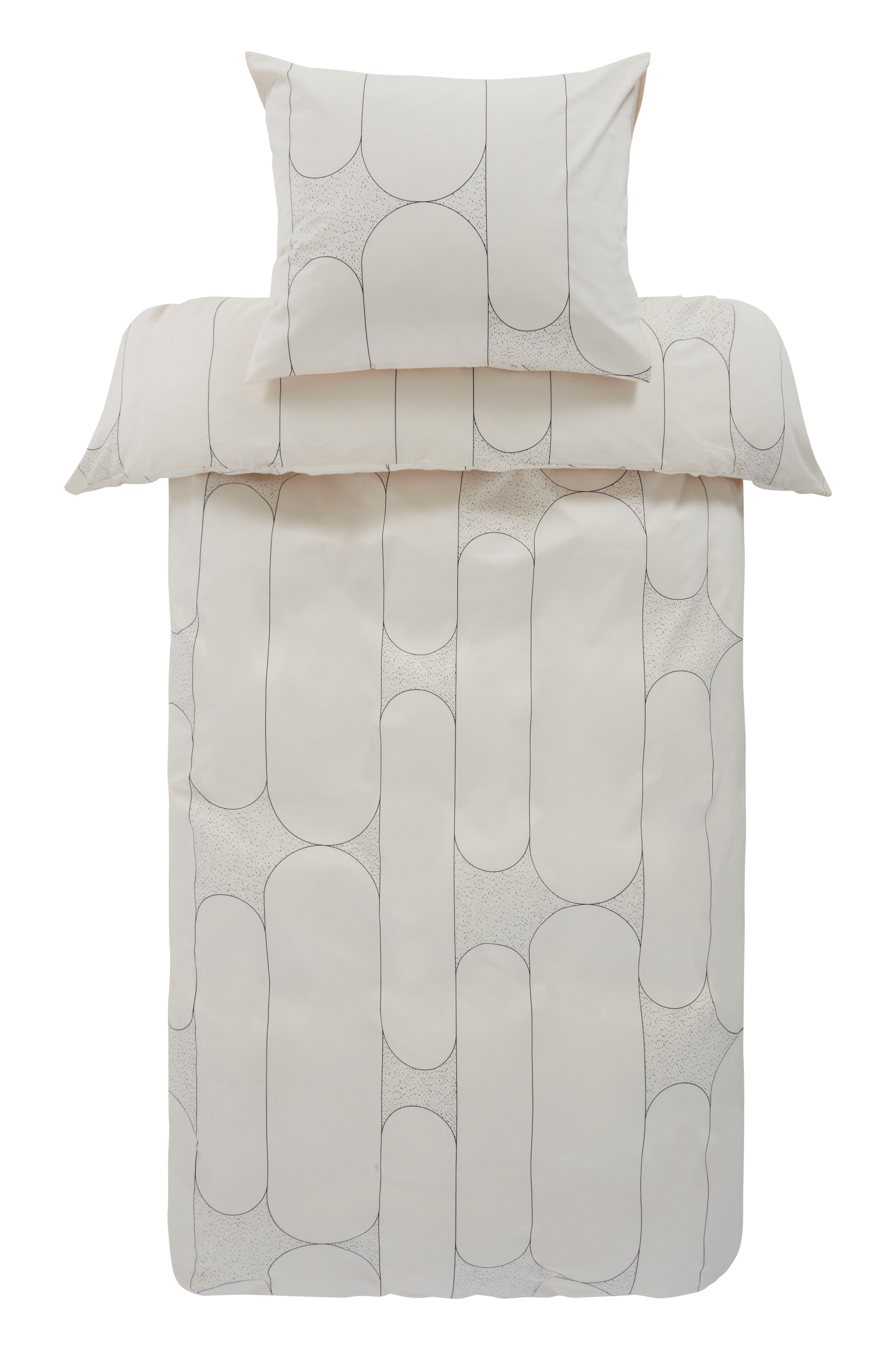 Sengesett i to deler, et dynetrekk og et putevar av bomull med trykt, diskret mønster. Bomull i sengetøy gir en behagelig følelse, mykt og litt svalt. Åpning øverst i hjørnene på dynetrekket. Det gjør det lettere å tre dynetrekket over dynen. Trådtetthet på 144 tc. (Trådtettheten forteller om antallet tråder, thread counts, pr. kvadrattomme i et stoff. Jo høyere trådtetthet, desto høyere kvalitet.)