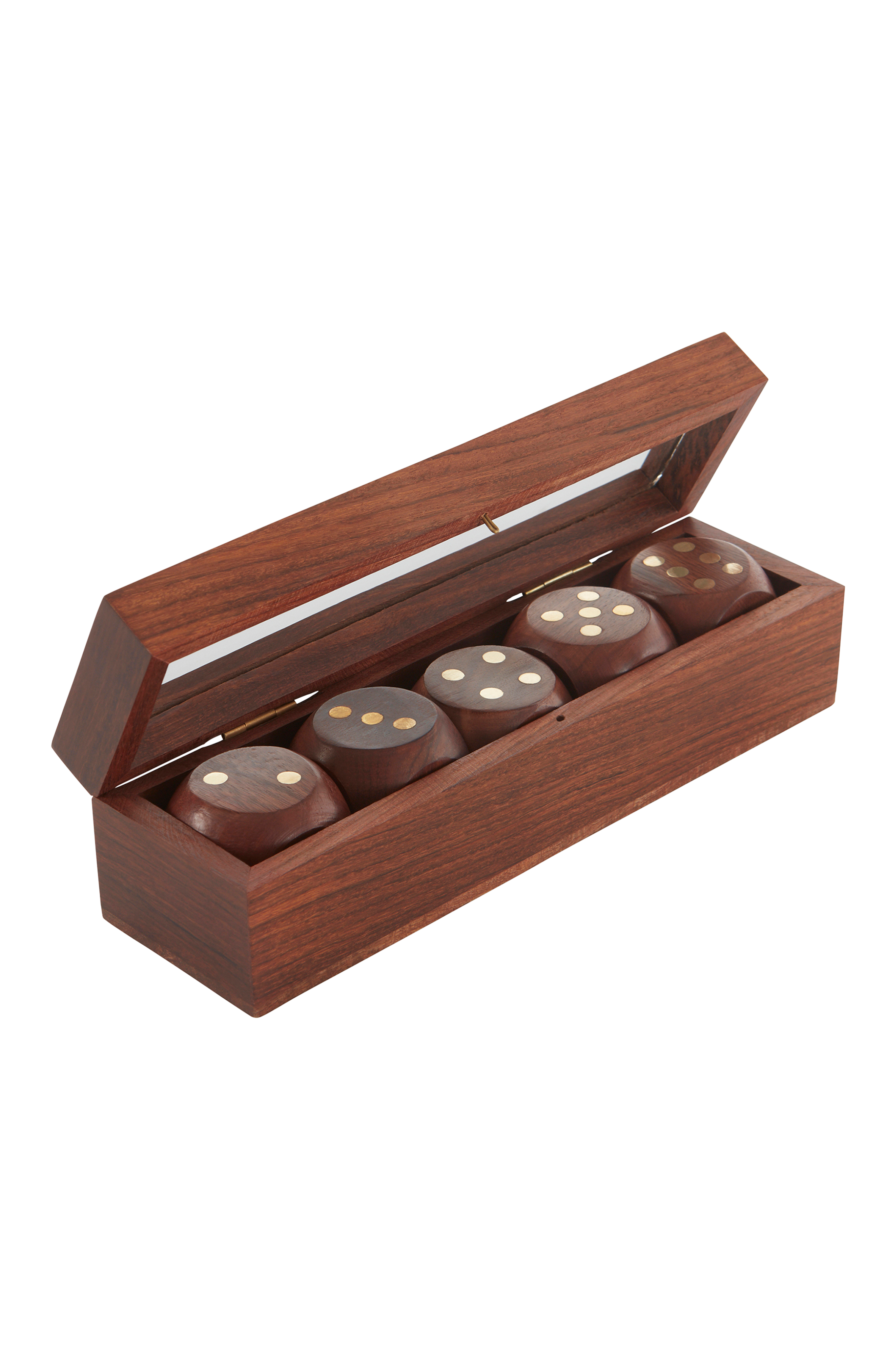 Vakkert treskrin i akasietre med messingdetaljer, inneholder 5 stk terninger. Treskrinet har glass i lokket. Perfekt lite treskrin til å ha fremme i stua slik at man enkelt kan spille når man får lyst.
