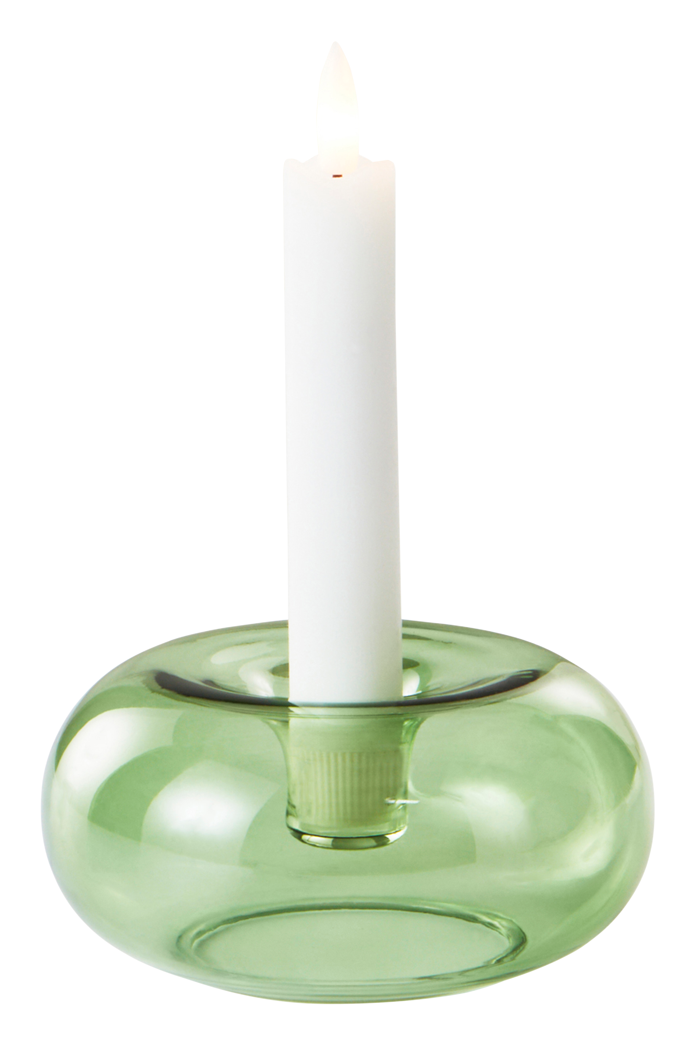Lysestake av glass. Velg blant fine farger. Den runde lysestaken har rett bunn og står stødig på bordet. Lys medfølger ikke.