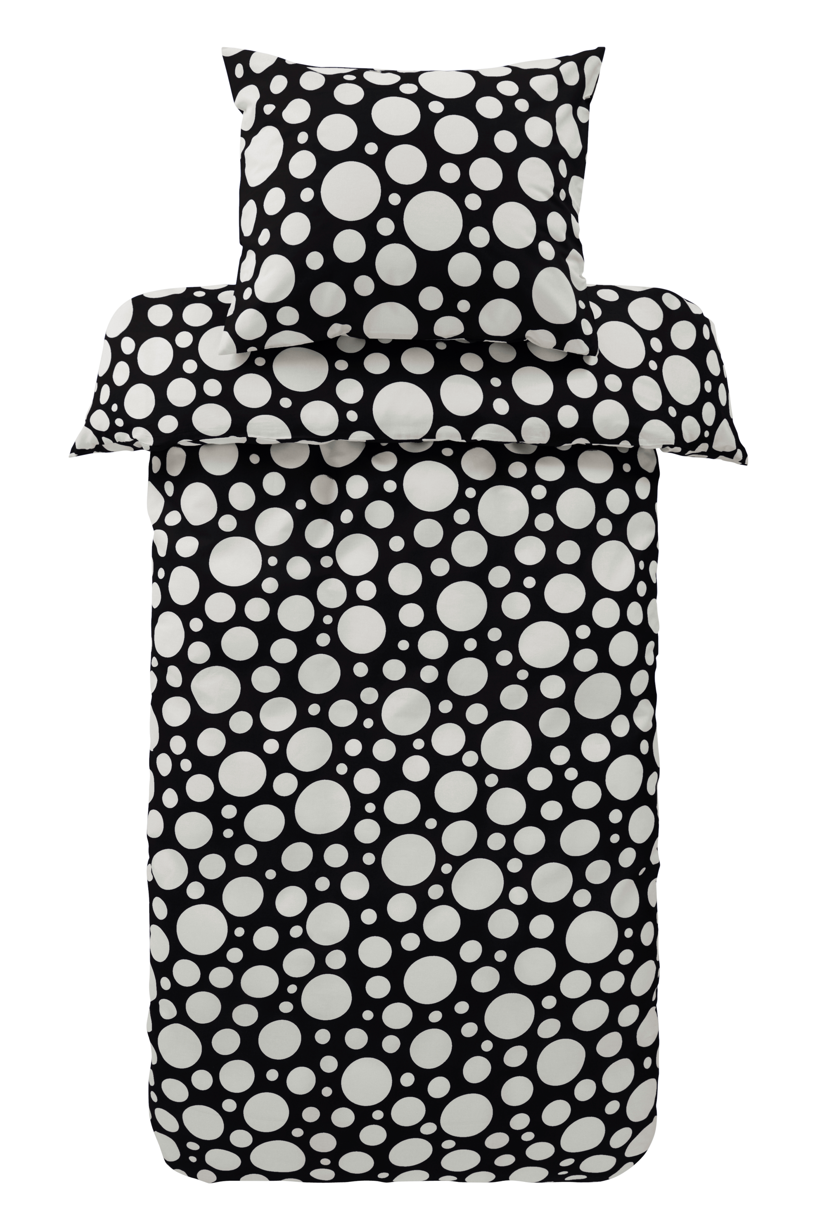 Sengesett i to deler med dynetrekk og putevar i herlig bomull med trykte, hvite prikker. Bomull er en sval og fresh kvalitet som føles behagelig mot huden. Åpning øverst i hjørnene på dynetrekket. Det gjør det lettere å tre dynetrekket over dynen. Trådtetthet på 144 tc. (Trådtettheten forteller om antallet tråder, thread counts, pr. kvadrattomme i et stoff. Jo høyere trådtetthet, desto høyere kvalitet.)