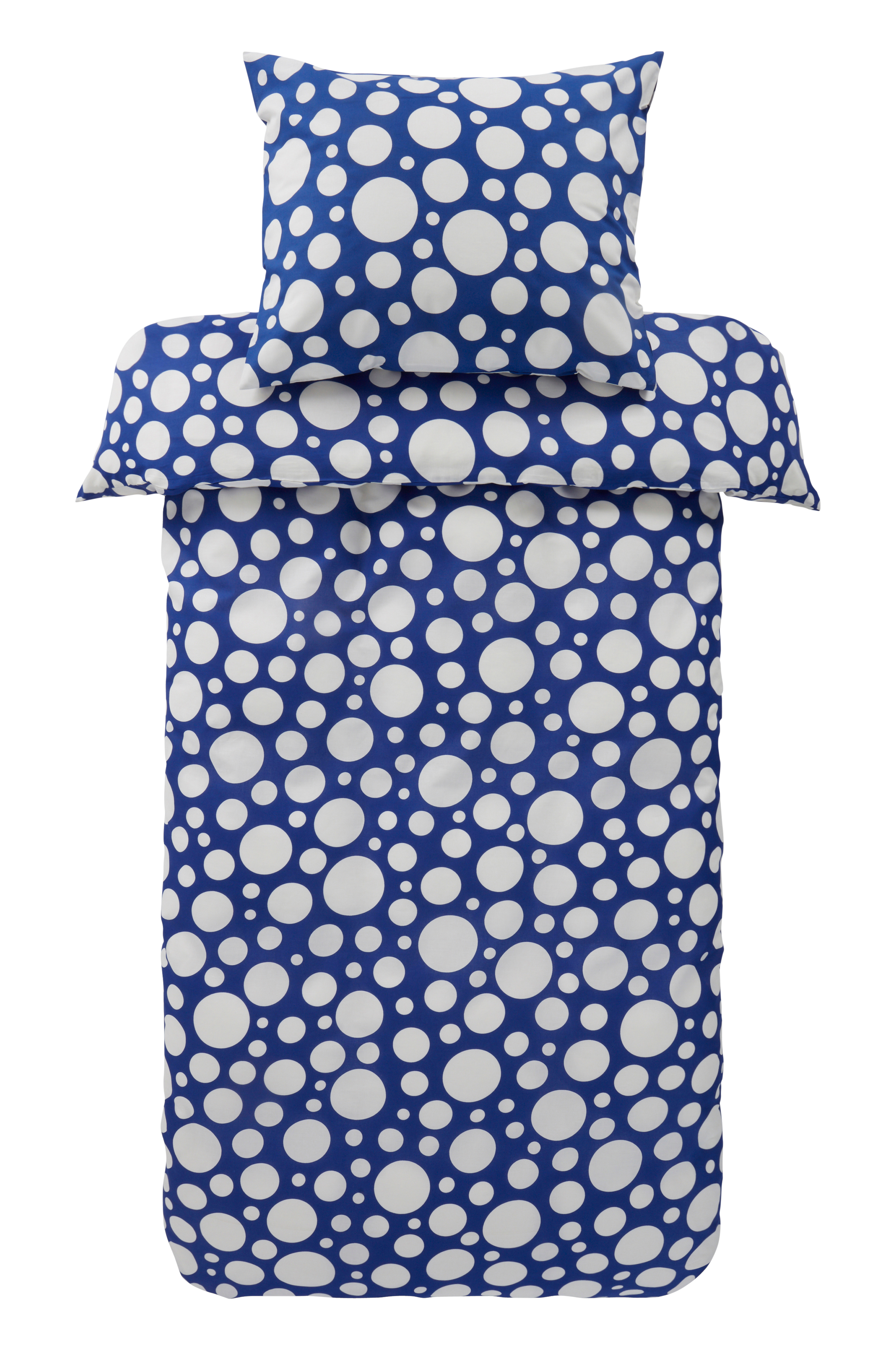 Sengesett i to deler med dynetrekk og putevar i herlig bomull med trykte, hvite prikker. Bomull er en sval og fresh kvalitet som føles behagelig mot huden. Åpning øverst i hjørnene på dynetrekket. Det gjør det lettere å tre dynetrekket over dynen. Trådtetthet på 144 tc. (Trådtettheten forteller om antallet tråder, thread counts, pr. kvadrattomme i et stoff. Jo høyere trådtetthet, desto høyere kvalitet.)