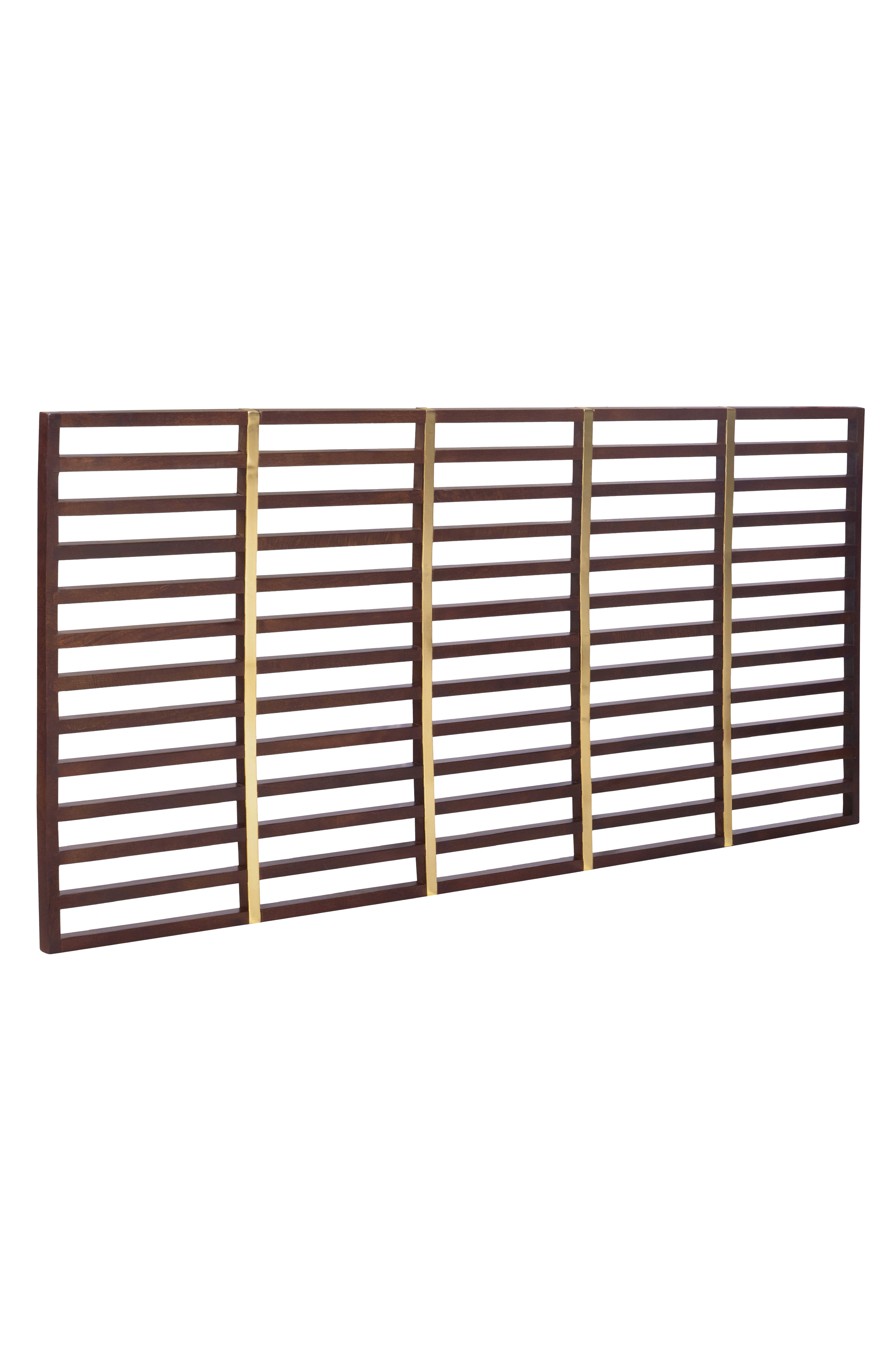 Frittstående sengegavl i mørkbeiset mangotre med gullfarget metalldekor. Mørkt tre sammen med gull gir en eksklusiv følelse, og den luksuriøs følelsen forsterkes når sengegavlen er bredere enn sengen.