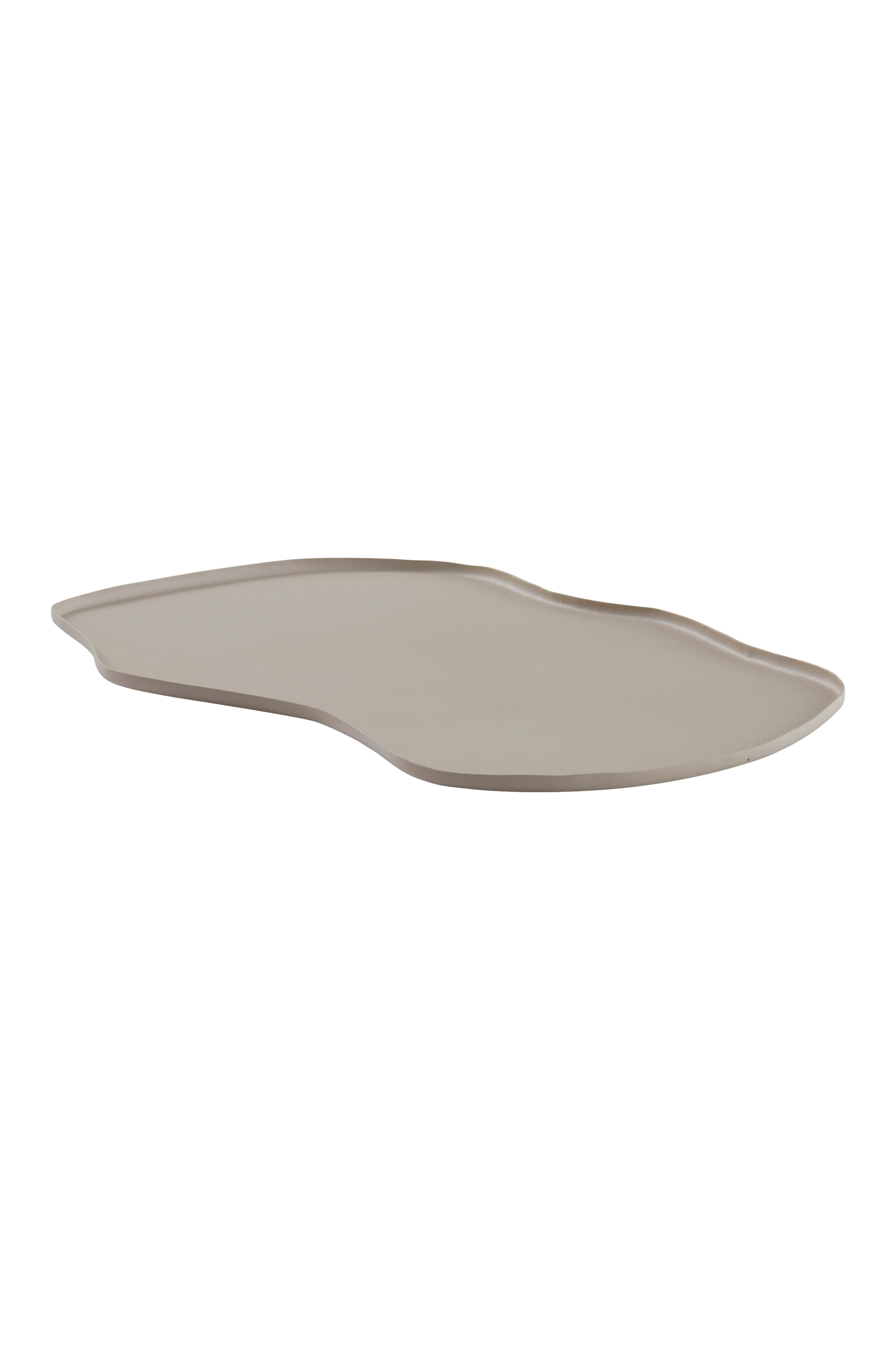 Brett eller serveringsfat av jern i uregelmessig, organisk form. DREW er vakkert for opplegg og fint å servere drikke eller brød på. Den fargede brettet har pulverlakkert, matt overflate, det sølvfargede er blankere.