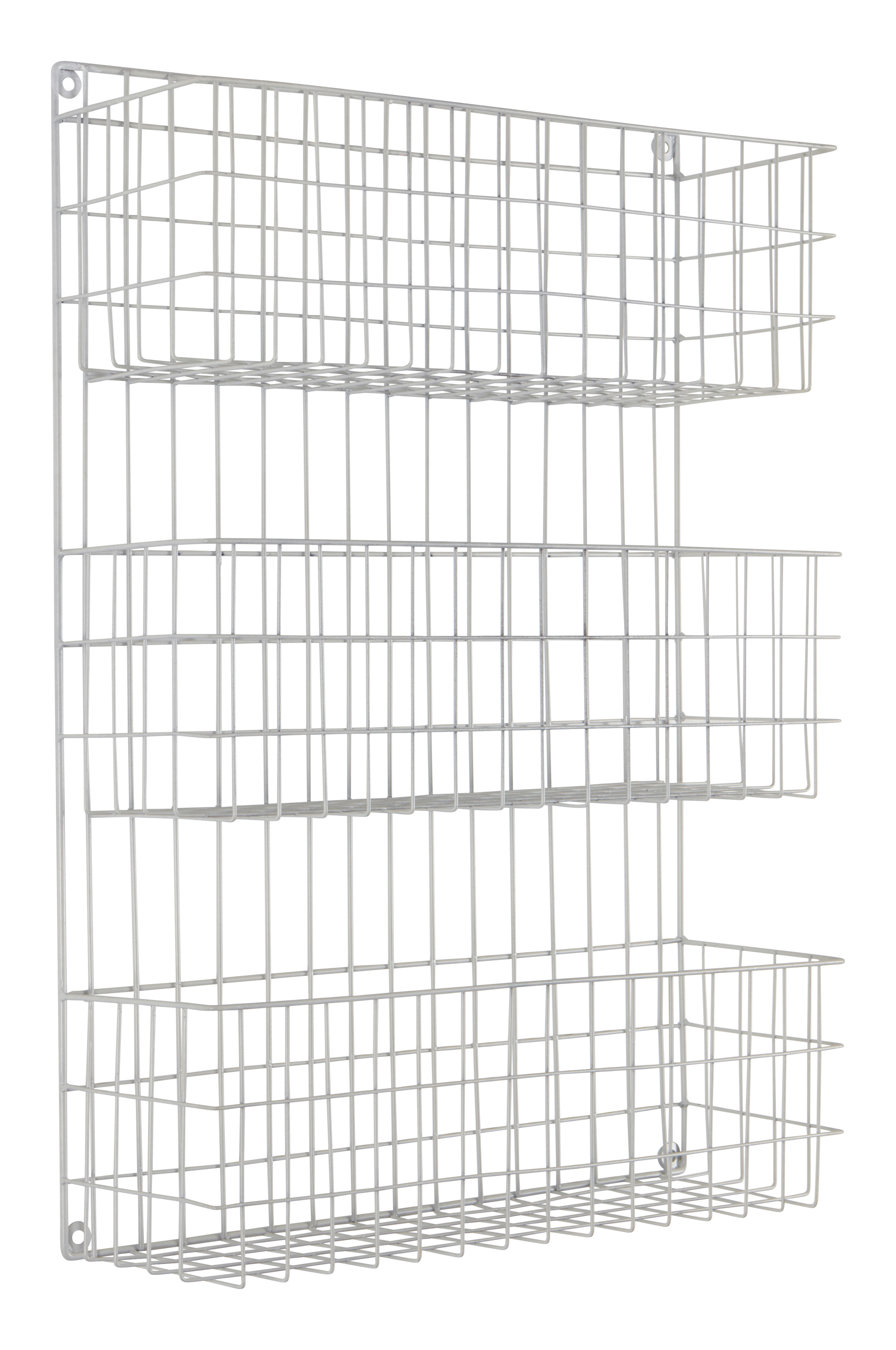 Hylle av jern som er ufarget eller har matt pulverlakkert overflate. Den praktiske oppbevaringshyllen har tre kurver og fester slik at du kan skru den opp på veggen. Å skape orden gjør livet enklere.