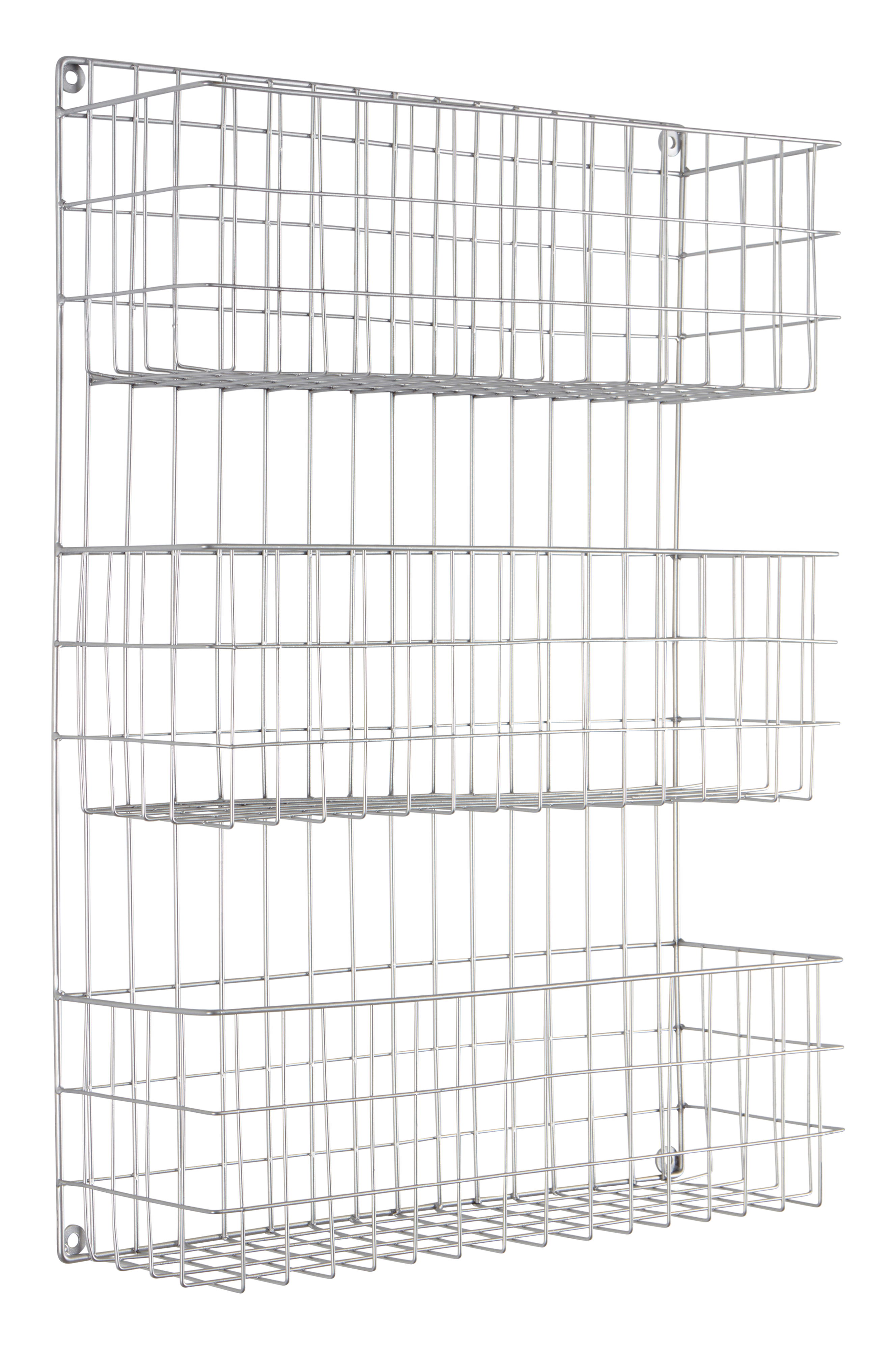 Hylle av jern som er ufarget eller har matt pulverlakkert overflate. Den praktiske oppbevaringshyllen har tre kurver og fester slik at du kan skru den opp på veggen. Å skape orden gjør livet enklere.