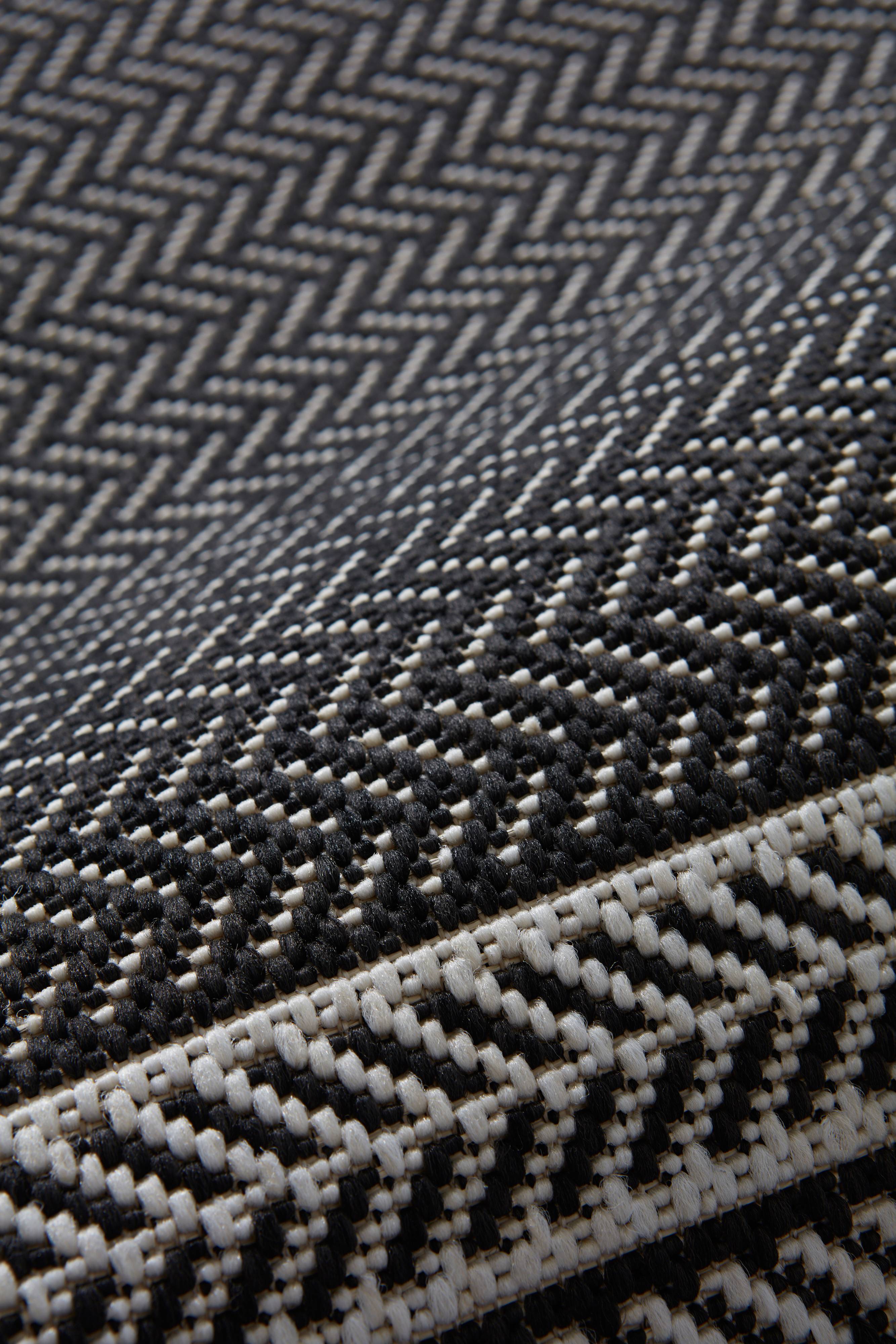 Glattvevd teppe av polypropylen med diskre fiskebensmønster over hele teppet med fargevalg som gir striper i kantene. Solid langettering / kanting rundt. Teppet er svært solid og dessuten lettstelt, noe som gjør at det passer inn der slitasjen er stor, f.eks. på vaskerommet, kjøkkenet, hallen eller hvorfor ikke utendørs under sittegruppen for å lage det lunt og koselig. Teppet tåler vann, og mugner ikke. Kan med fordel brukes utendørs. UV-resistent. Tykkelse: 0,7 cm. 1150 g/m².