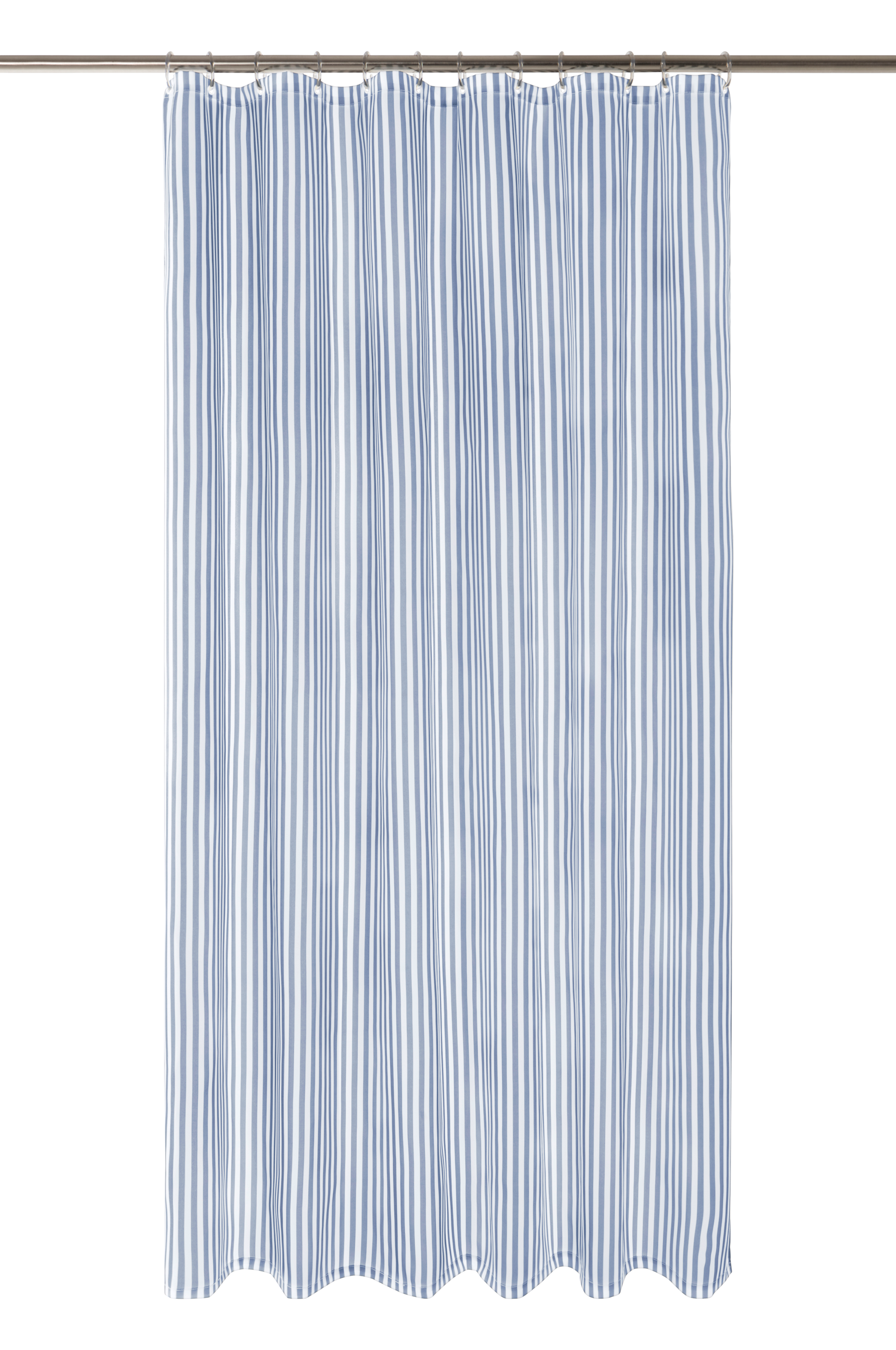 EMMY dusjforheng har et karakteristisk digitaltrykt stripemønster som gir en frisk baderomsopplevelse. Laget av polyester med vannavstøtende behandling og 12 matte øyer i kobber for å forhindre rust. Bland stil og praktiske løsninger uten problemer. Kos deg på badet!