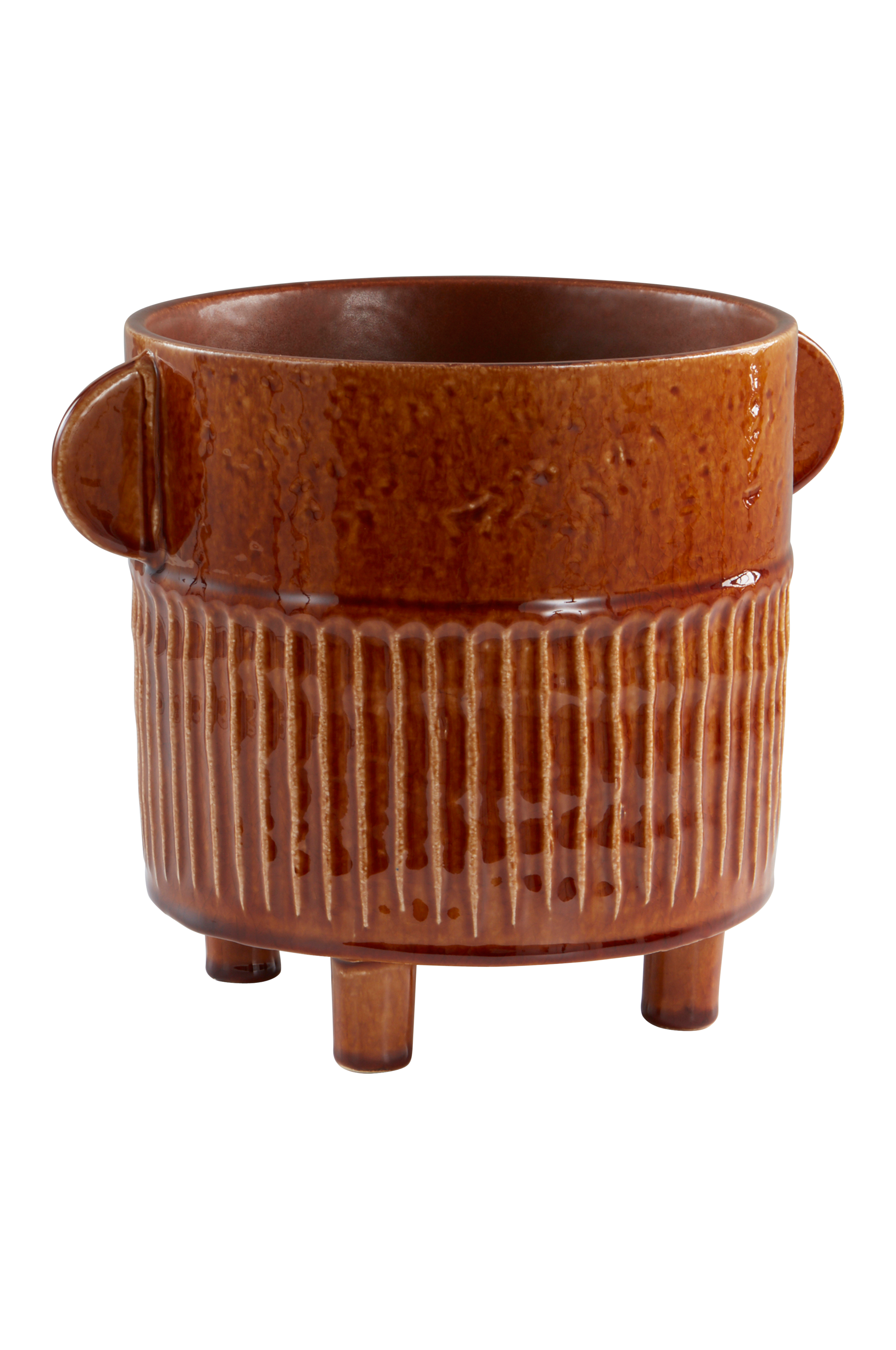 Håndlaget keramikkpotte med melert glasur, også innsiden er glasert. Potten er spesiell i formen med riflet teksturmønster, fire små ben og to hanker. Det fine håndverket gjør hver potte unik. Husk at keramikk kan slippe gjennom fukt.