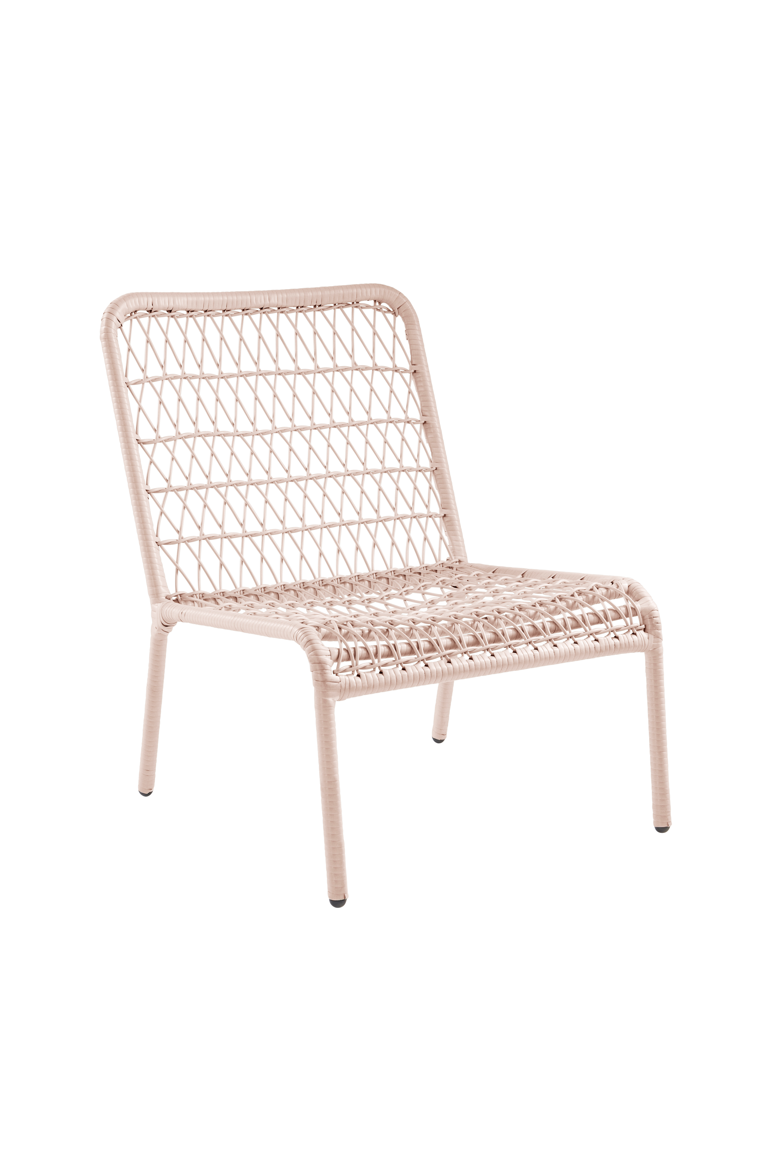 Loungestol i værbestandig kunstrotting av plast med ramme av aluminium. Det pent flettede setet og ryggen har rottingfølelse, men er mer solid. Rammen av aluminium er tvunnet med kunstrotting for å forsterke følelsen av rotting. Aluminium er et praktisk materiale utendørs. Det tåler vær og vind, og ruster ikke.