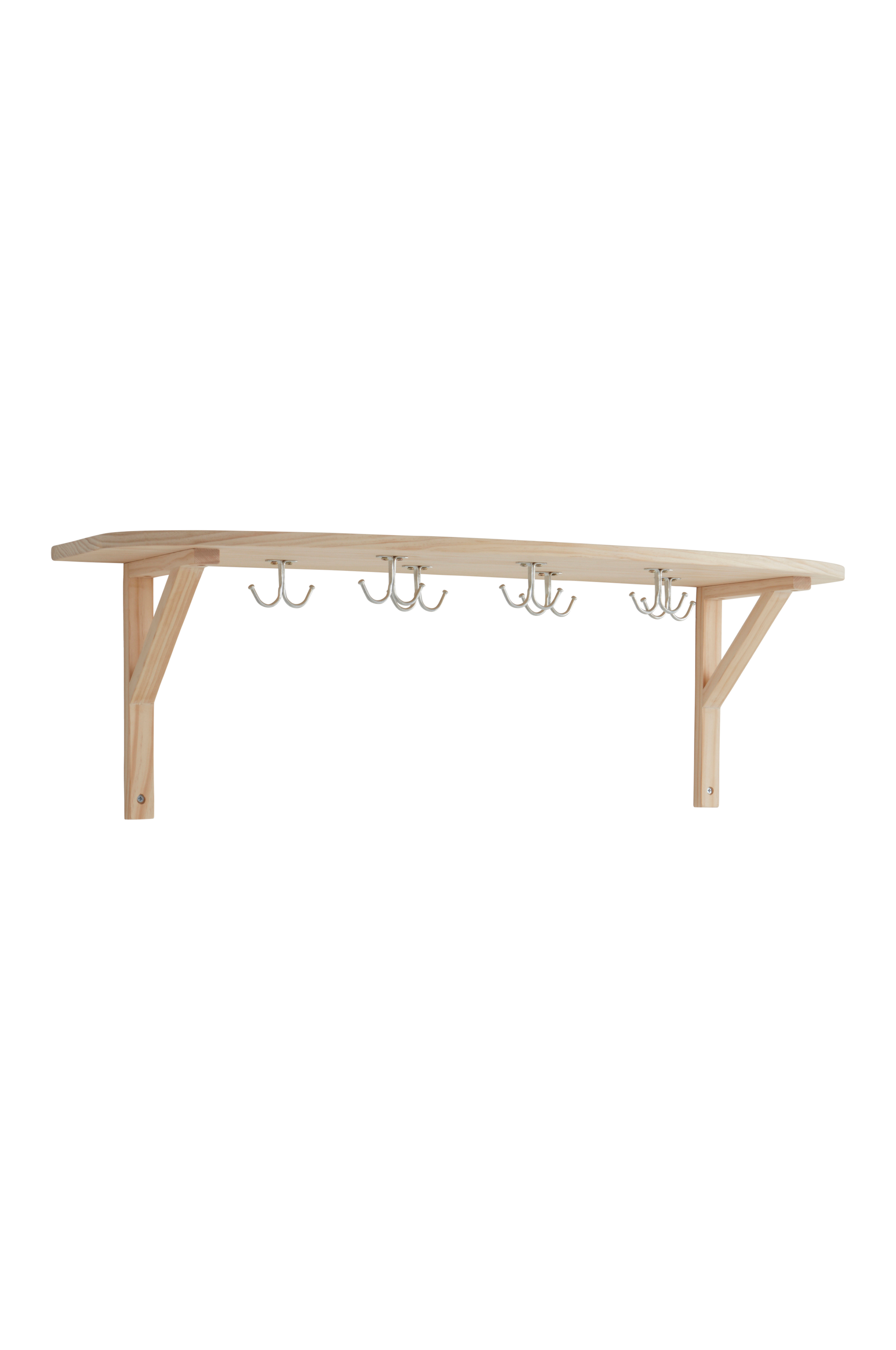 Håndlaget hattehylle av FSC-sertifisert, ubehandlet furu med knagger av jern. Denne veggmonterte hattehyllen er i stilren, nordisk design med en hylle som du fester på to konsoller i veggen. Modellen er praktisk siden skohyllen monteres på veggen i den høyden du ønsker. Noe montering kreves. Monteringsanvisning medfølger.