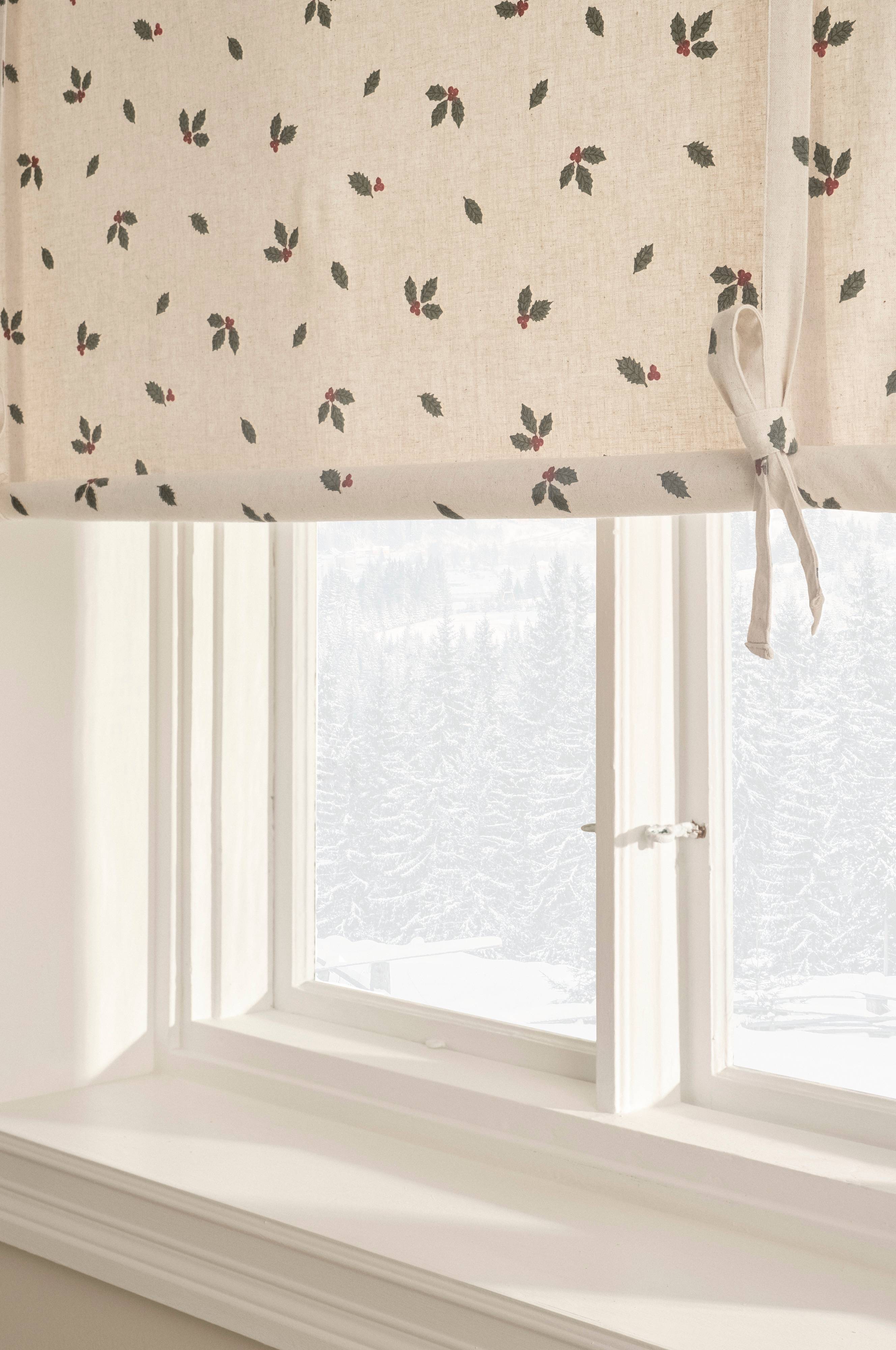 Roll up-gardin i en velvalgt kvalitet av bomull og lin. Den myke bomullen får fasthet og struktur av linet som blandes inn, det blir en perfekt miks. Stoffet er ufarget med naturlig bunnfarge. Deretter er det påført et vakkert trykk av små kvister av kristtorn med røde bær. Det fine mønsteret er hjemmekoselig og passer fint til advent og jul. Produktet er plaggvasket, noe som betyr at det vaskes etter søm for å bli smidig med en myk følelse. Roll up-gardinen henges på vanlig gardinstang. Høyden reguleres med knytebånd. Stoffets gramvekt er 210 g/m².