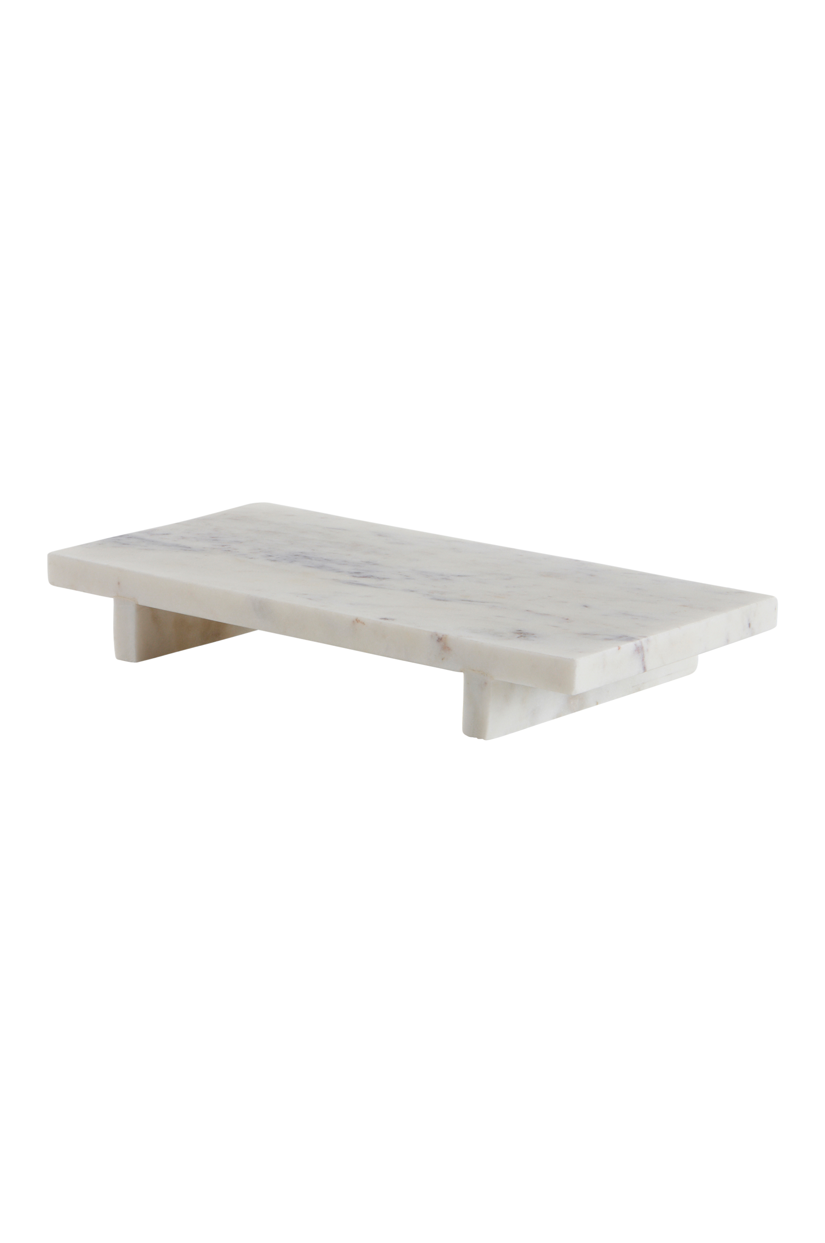 Rektangulært serveringsfat av marmor med lang, smal marmorfot i hver ende slik at fatet kommer litt opp fra bordplaten. Marmor er en naturstein, og mønsteret varierer alltid litt avhengig av bergartens sammensetning. Dette gjør hvert objekt unikt.