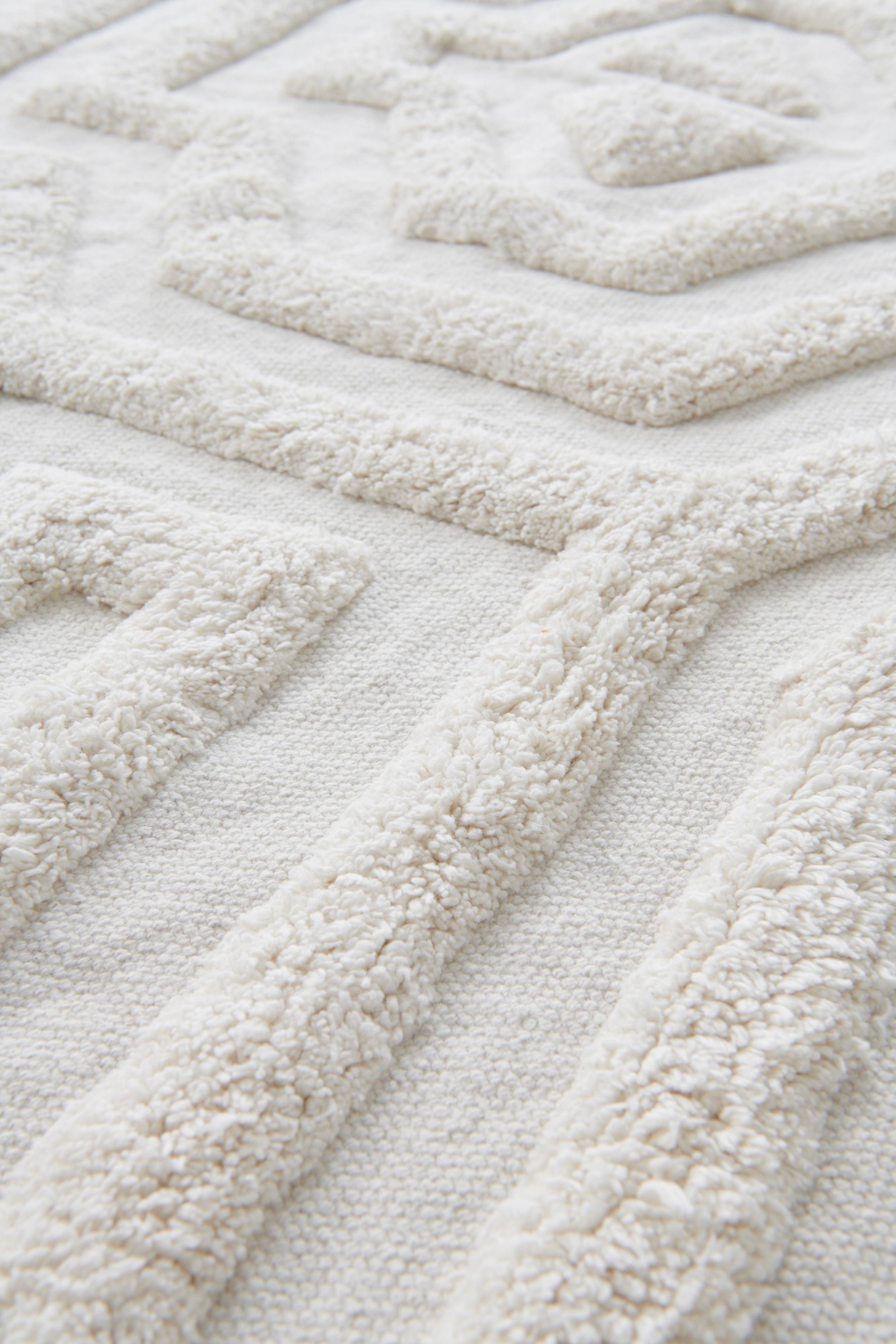 Rundt, ensfarget teppe av bomull med frynser rundt. FILTON har relieffmønster ton-i-ton, tuftede partier på vevd bunn skaper spennende effekt. Frynselengde 9 cm. Tykkelse 1 cm. 1400 g/m².