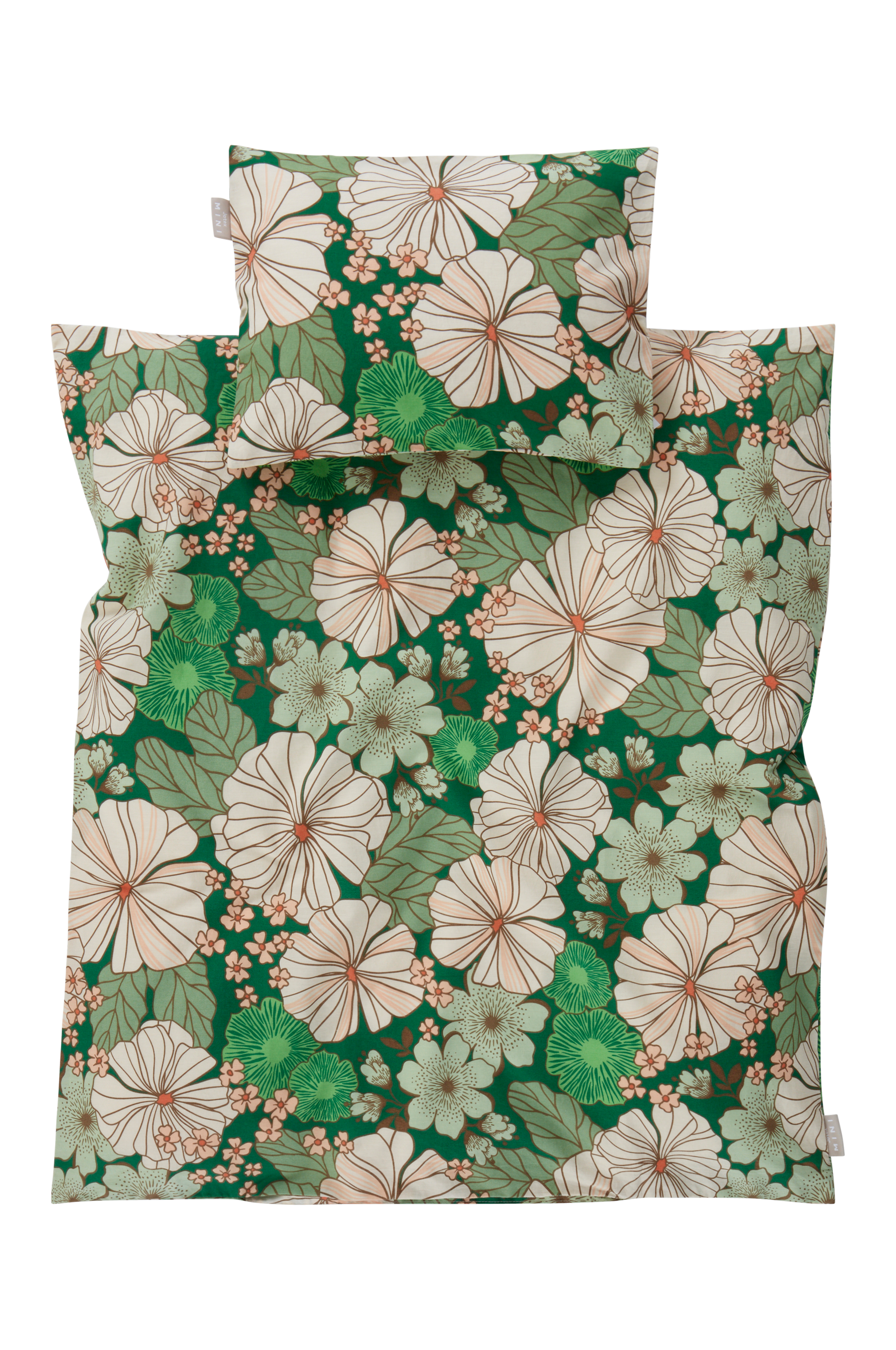 Todelt dynetrekkssett med et dynetrekk og et putevar i fintrådet, tettvevd bomullskvalitet. Stoffet har et herlig blomstermønster med trykk i en vakker fargeskala. Det er også enzymvasket, noe som gir det en behagelig mykhet og en litt slitt følelse. Settet er egnet for barnesenger.
