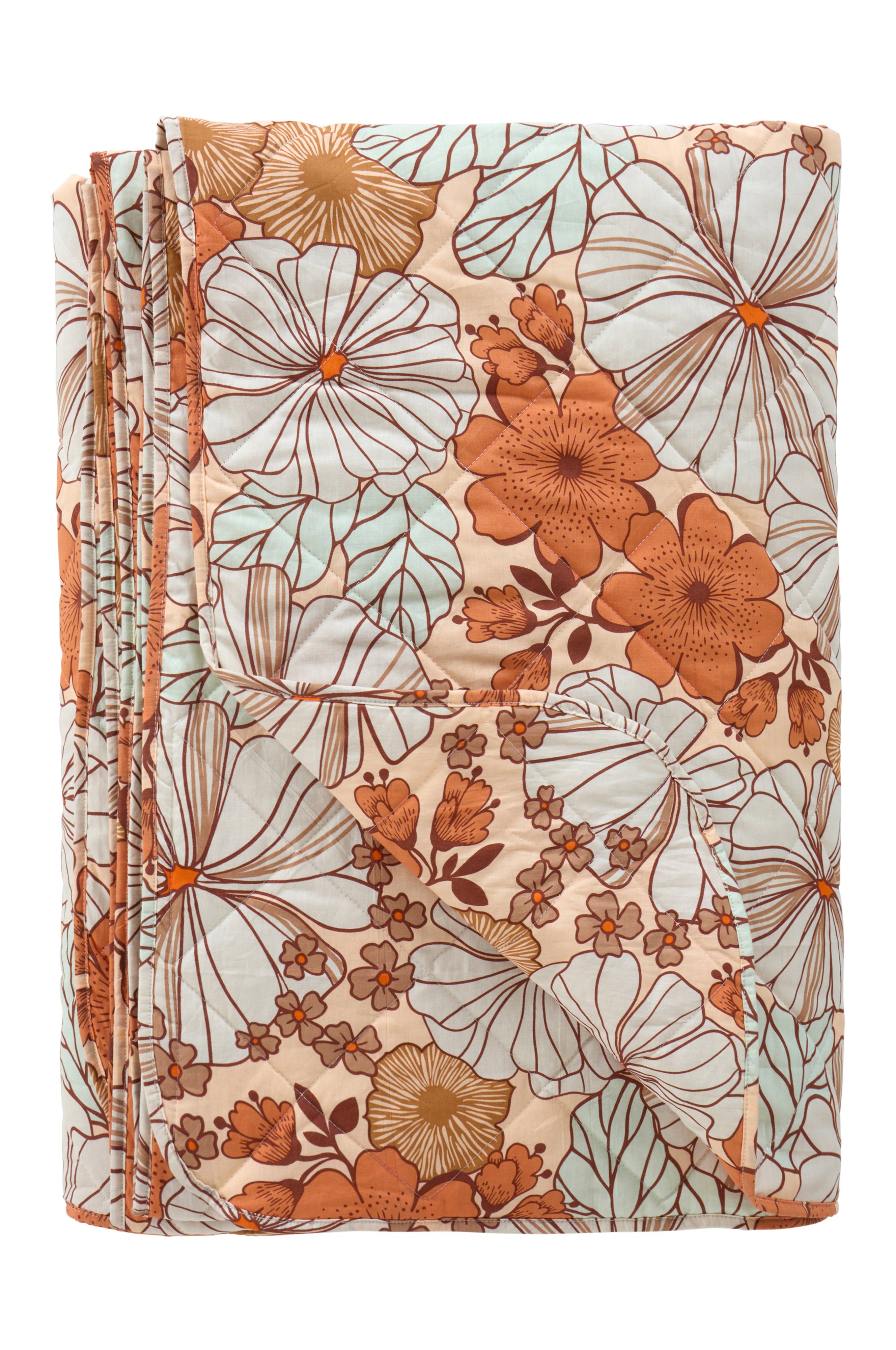 Sengeteppe i fin, tettvevd bomullskvalitet. Stoffet har et nydelig blomstermønster i fine farger, og det er quiltet slik at det lette fyllet holder seg på plass. Det er også enzymvasket, noe som gir en behagelig mykhet og en litt slitt følelse. Sengeteppet er vendbart med blomster på begge sider og kant rundt.