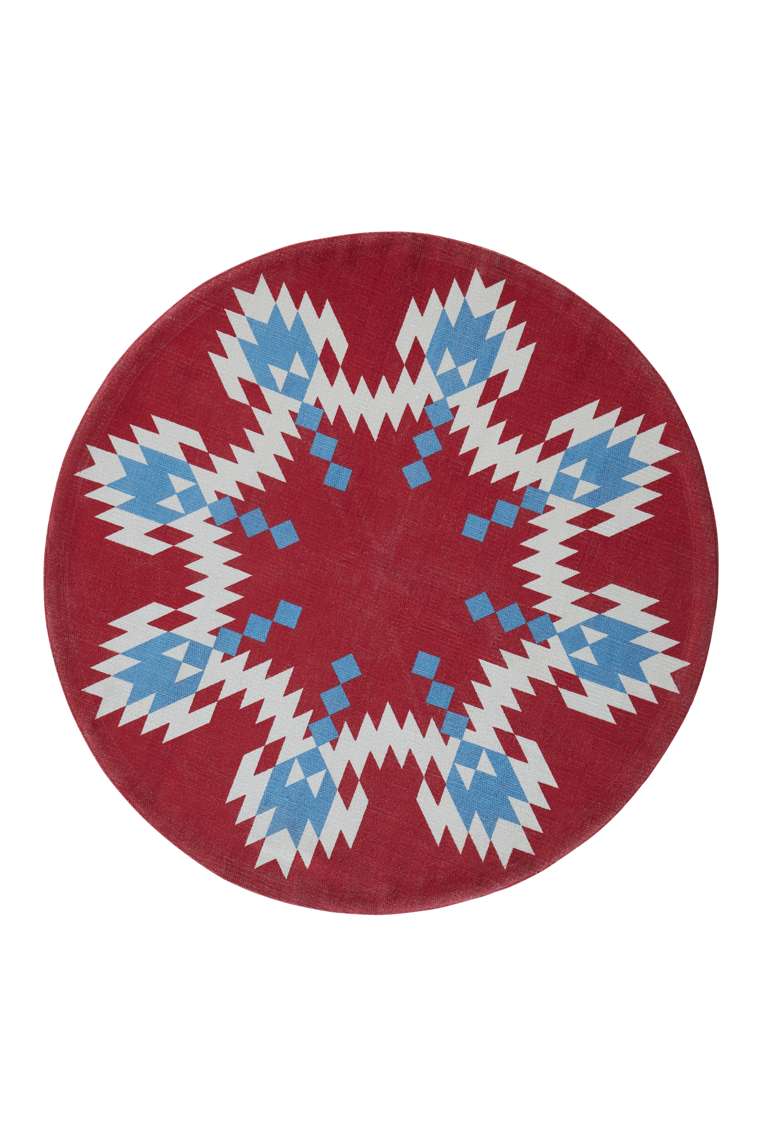 FLAKE er et juletreteppe i unik design av Mikael Selin. Den runde teppet er håndvevd av gjenvunnet polyester. Teppet er herlig julerødt med trykt mønster i isblått og grått. Tykkelse 0,6-0,7 cm. 800-850 g/m².